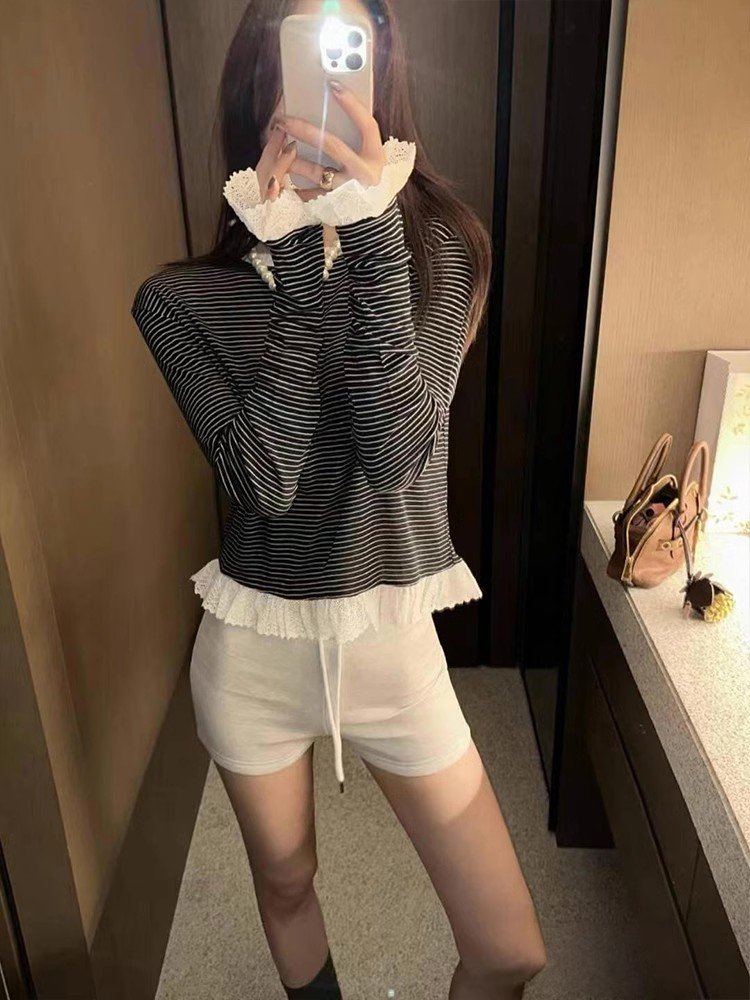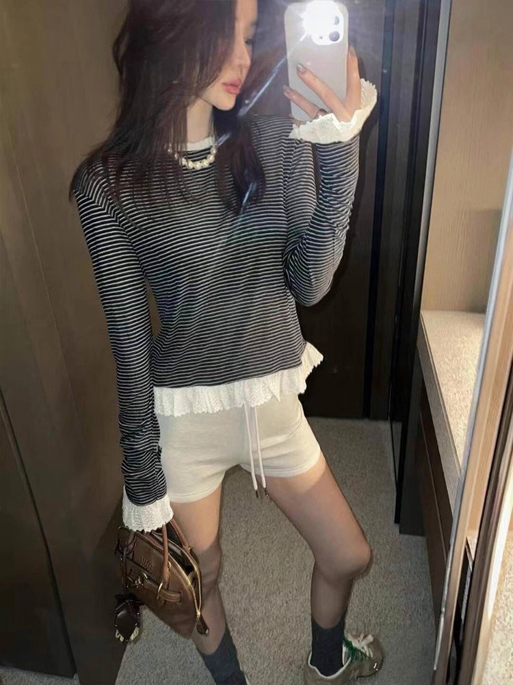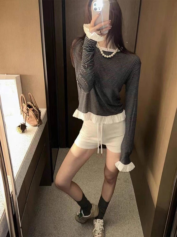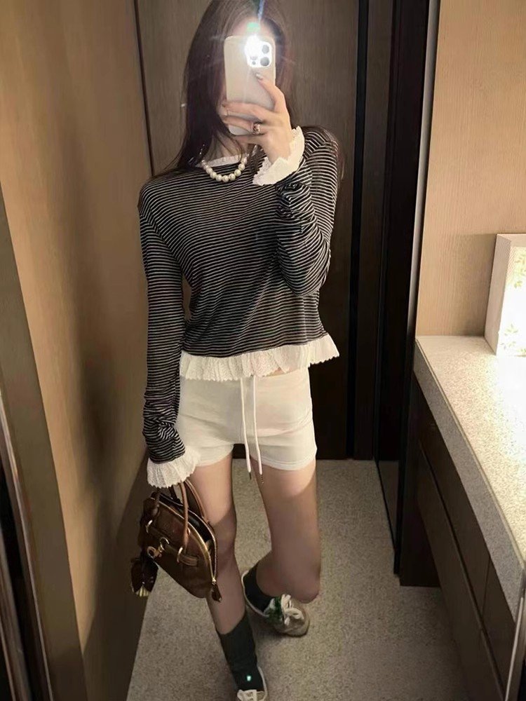 韩系黑白条纹圆领正肩长袖t恤女早春季不规
