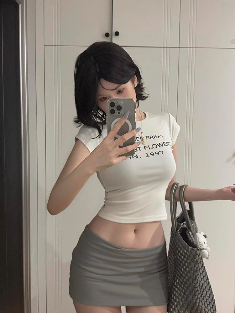 小个子白色短款小飞袖字母印花短袖t恤女春