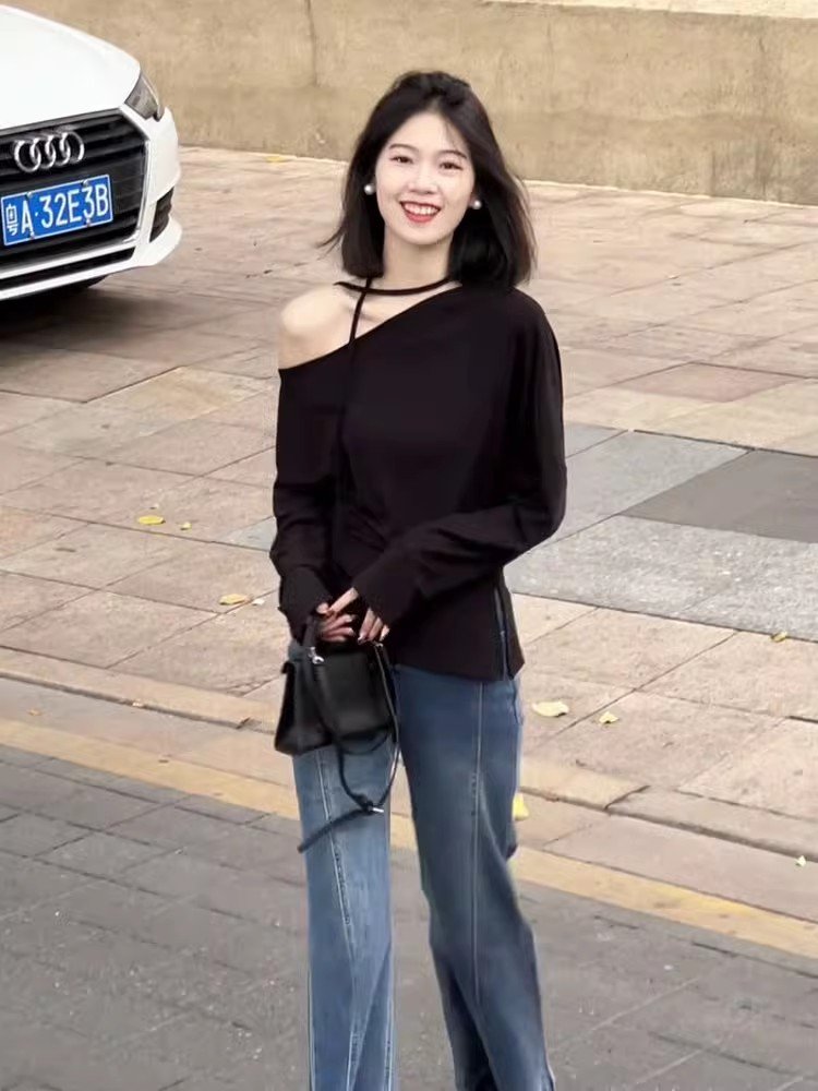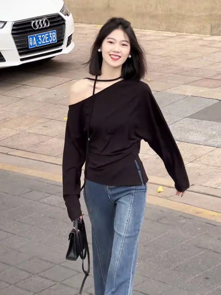韩系内搭白色挂脖斜肩长袖t恤女春季性感辣