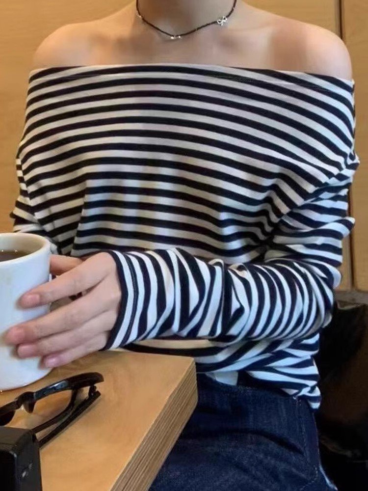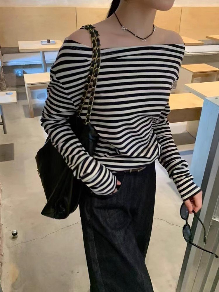 韩系内搭黑白条纹一字肩长袖t恤女早春季修