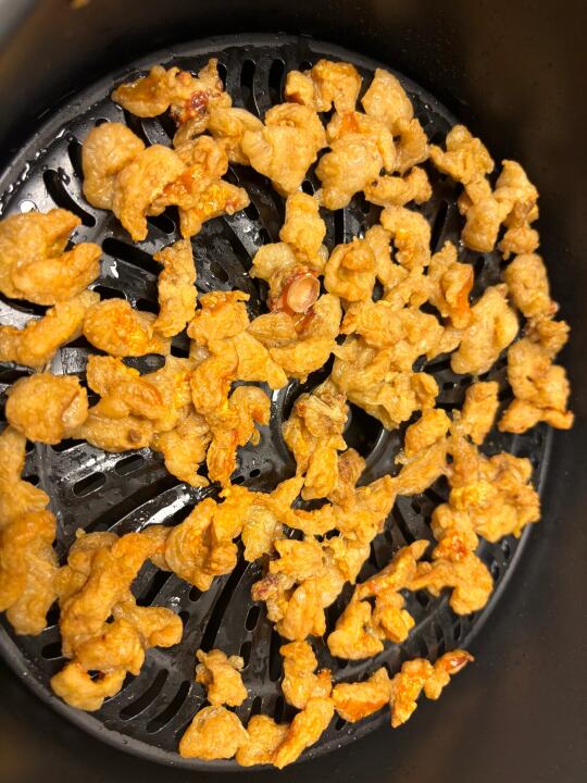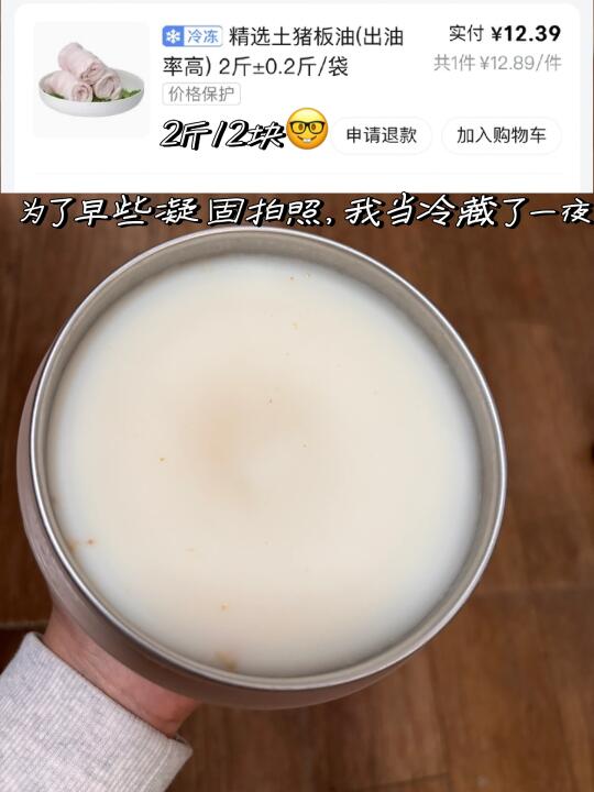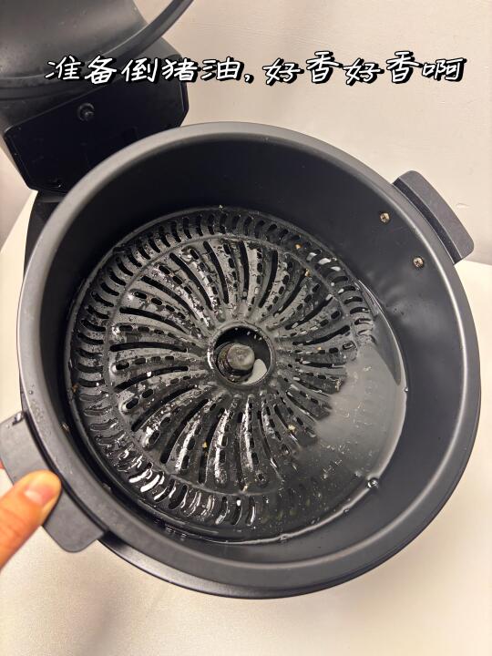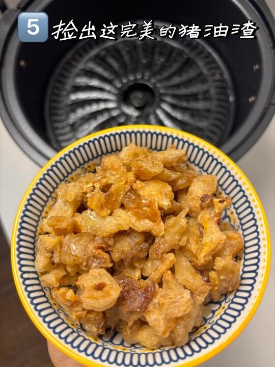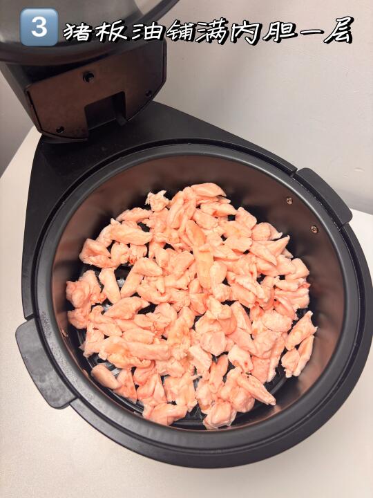 上次用传统方式熬的猪油 全程都守在厨房可累了 这次直接用空气炸锅! 1️⃣剪块代替切块,可免洗菜板 2️⃣空气炸锅内胆洗干净 3️⃣猪板油铺满内胆一层 4️⃣200度25分钟即可 5️⃣捡出猪油渣、倒出猪油 放置半天后凝固