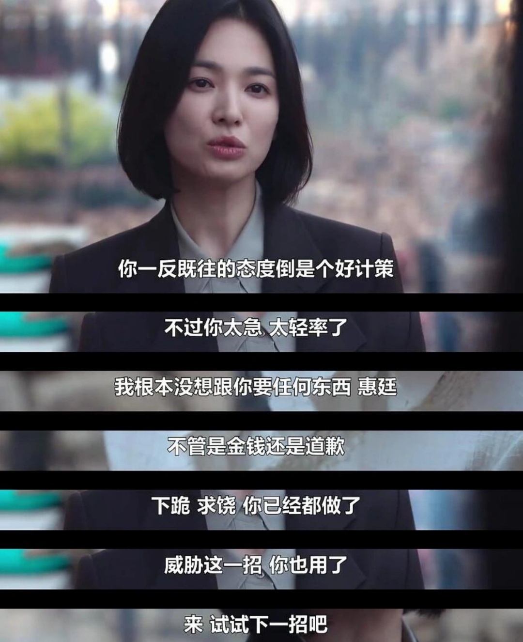 崔慧廷:东恩啊,我家开洗衣店的,我那时候小,他们逼我的,谁能不犯错呢? 东恩:空姐小姐,放任自己做知道后果的事情,那叫作恶! 崔慧廷:我已经辞职了,不结婚也没有收入了,结婚前请不要再见我婆婆。 东恩:招数用的不少了,下一招是什么? 崔慧廷:西八,你要什么贱人? 东恩:你是不是丢过手机?看看我了解你有多深? 崔慧廷:……东恩,以后我都听你的了!
