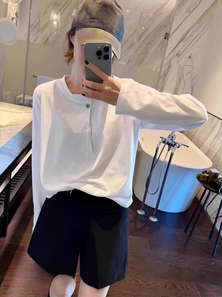 欧货白色纯棉长袖T恤女春秋新款宽松内搭打