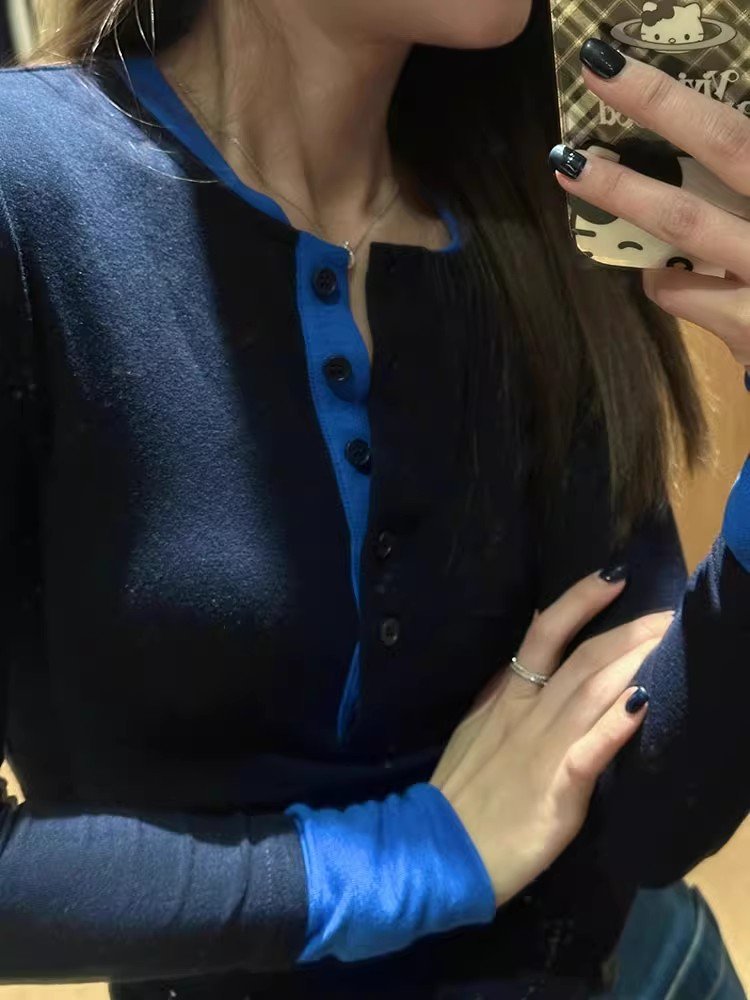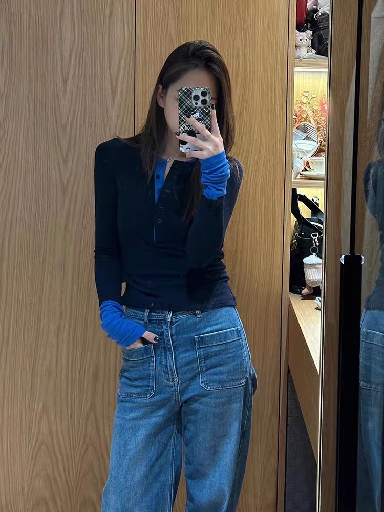 韩系藏蓝色假两件v领长袖t恤女早春季内搭