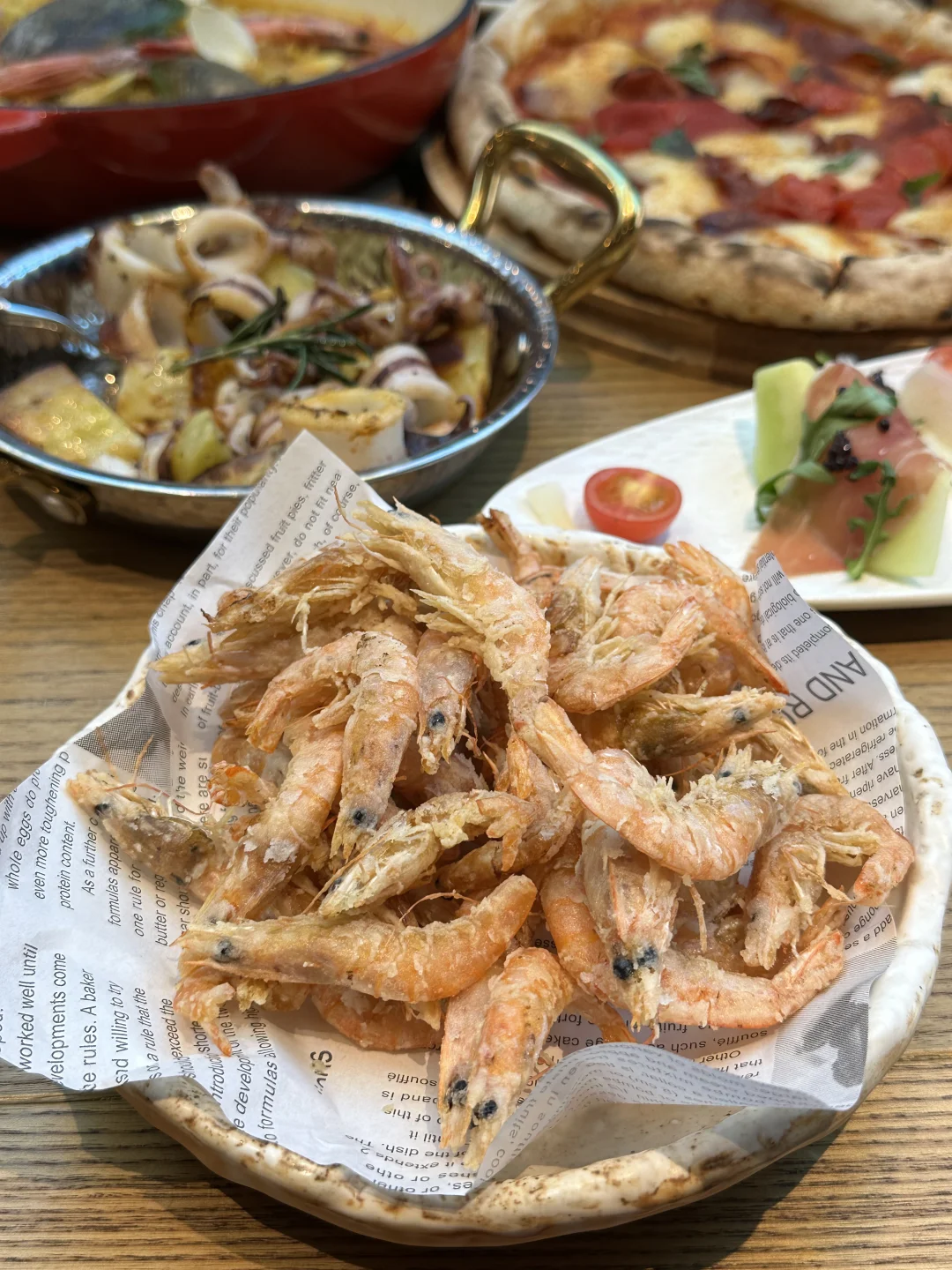 上海路超爱的意式小馆终于开来河西了 披萨都是窑烤哒🍕 海鲜饭是偏湿口哒🦞 炸小河虾、蒜香鱿鱼配烤土豆、草莓提拉米苏、千层面…都好喜欢啊!!!