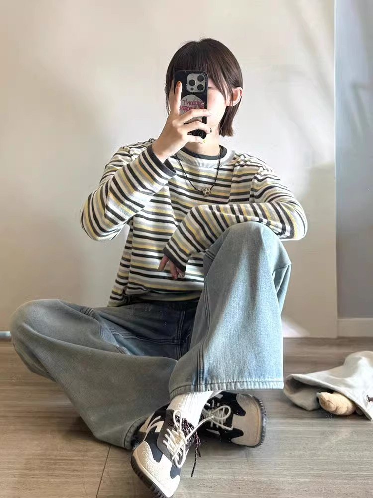 美式复古撞色条纹长袖t恤女早春季宽松打底