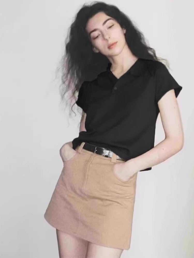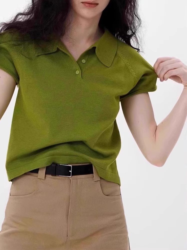 法式短款绿色Polo领正肩短袖t恤女夏季