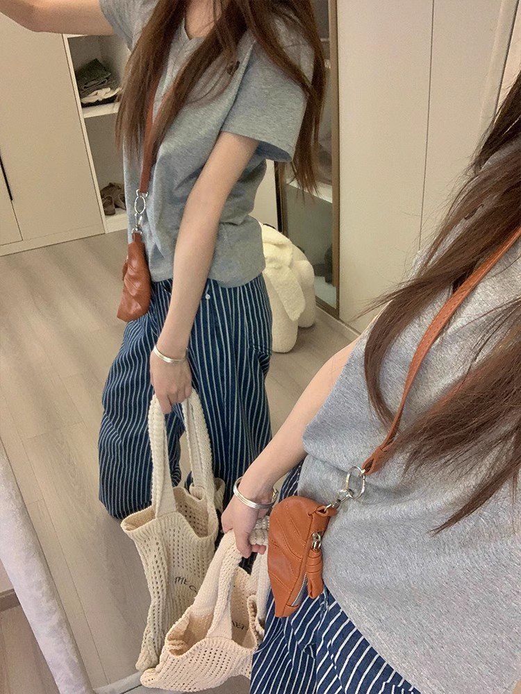 韩系灰色刺绣圆领正肩短袖t恤女夏季小众设