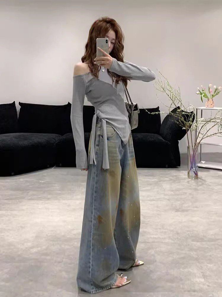 法式黑色斜肩长袖t恤女春秋季不规则修身短