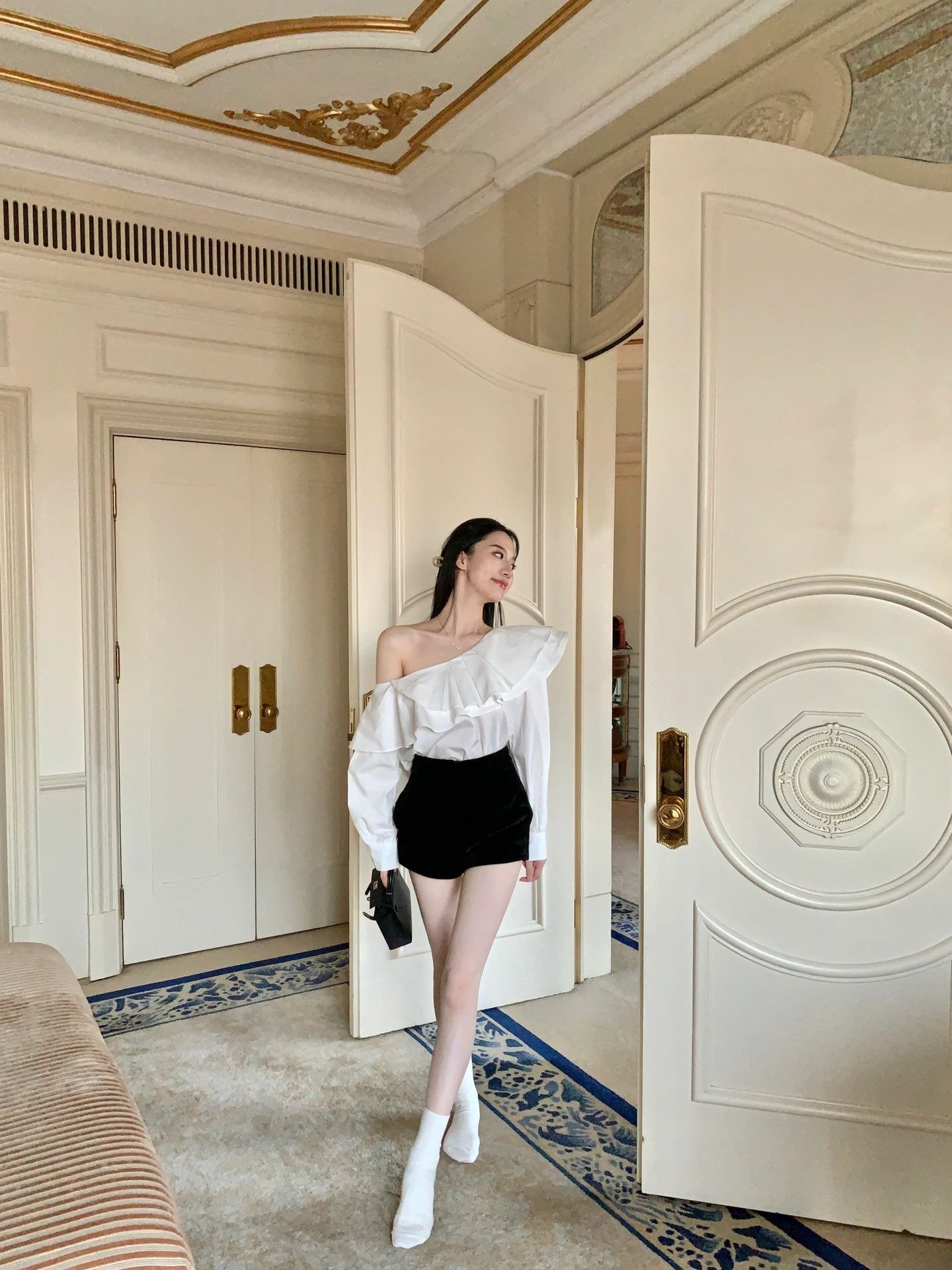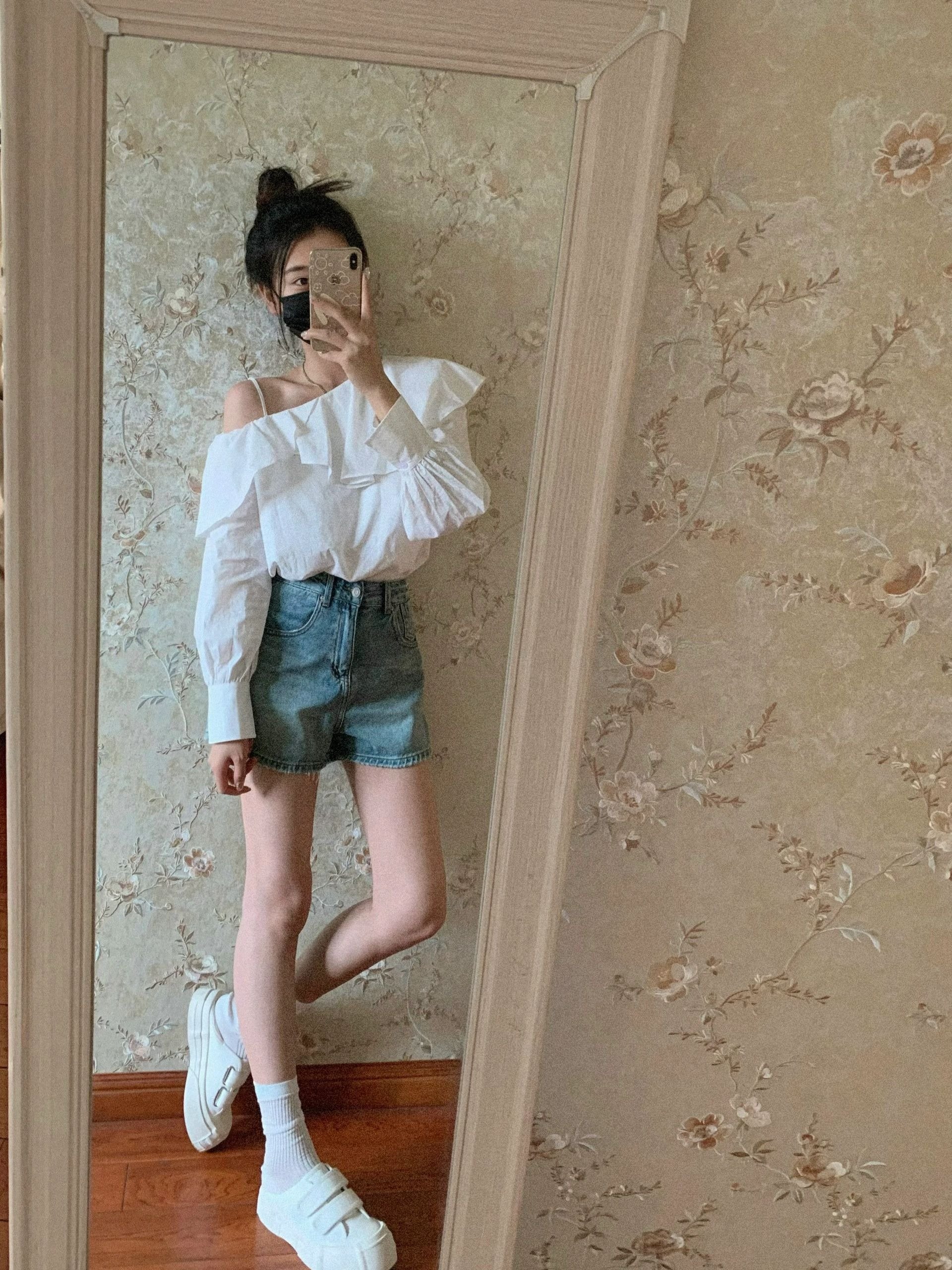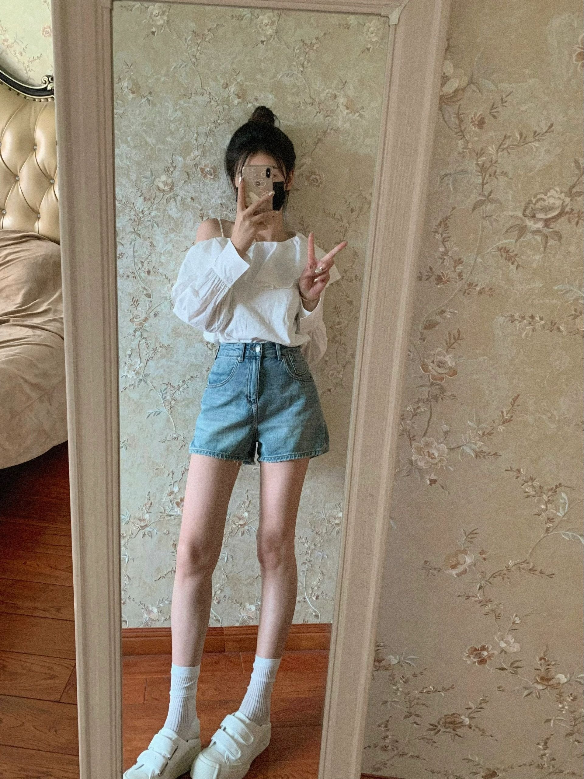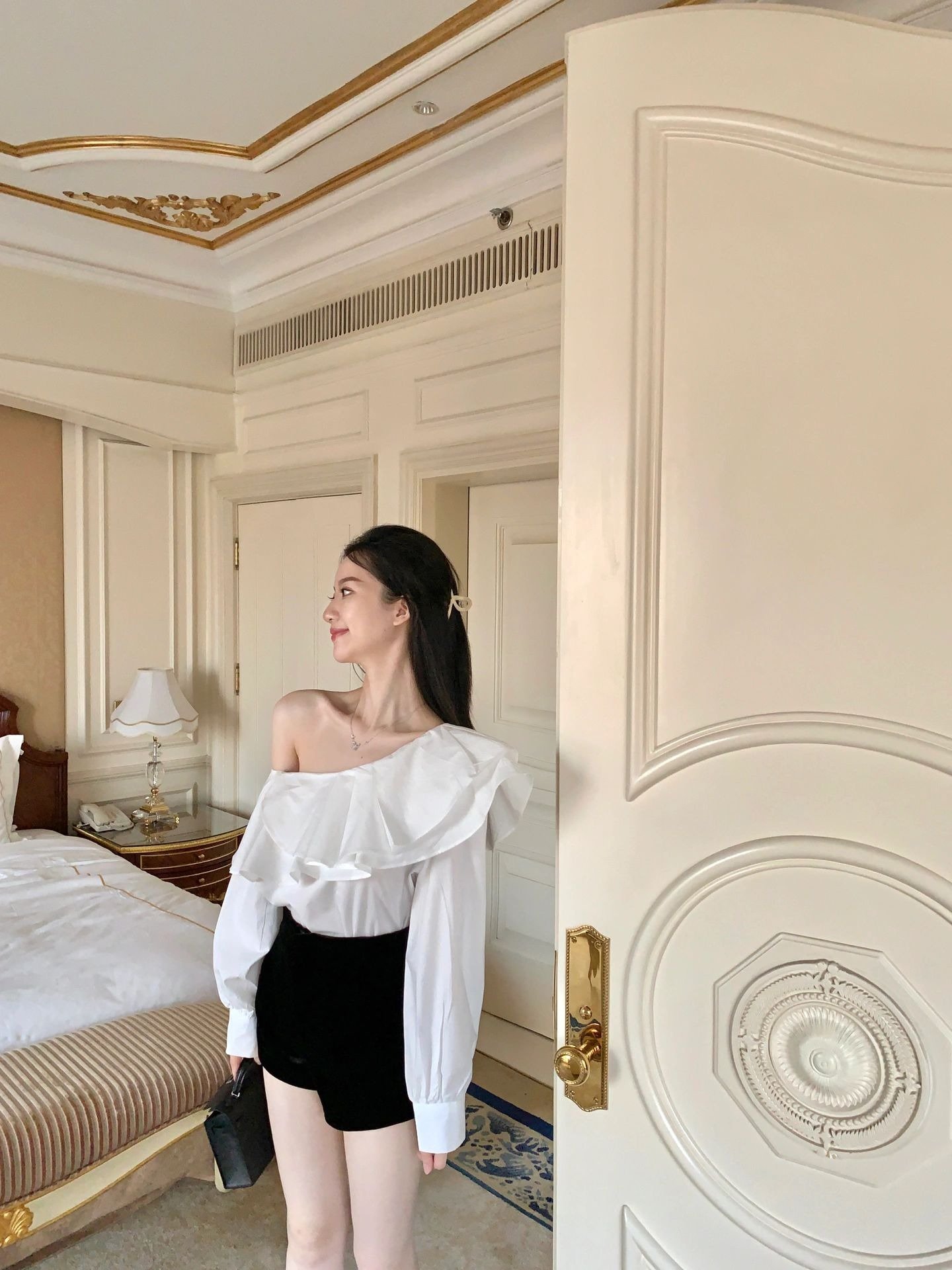 白色荷叶边斜肩长袖衬衫小个子漂亮衬衣小衫