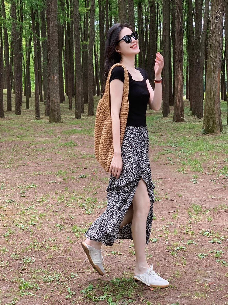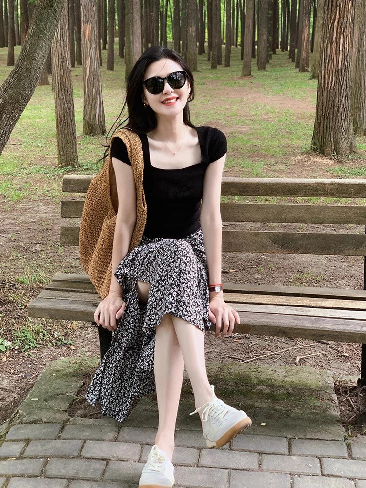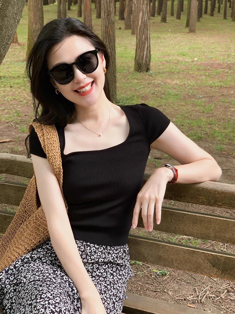 韩系黑色方领小飞袖短袖冰丝t恤女夏季小个