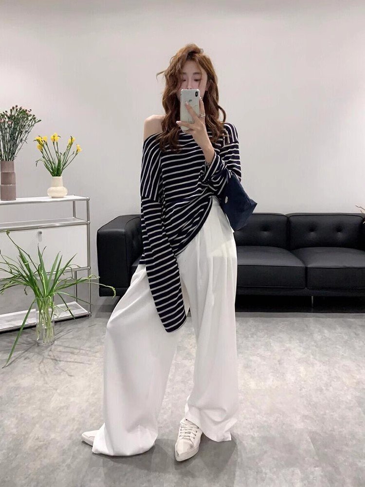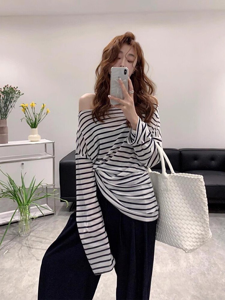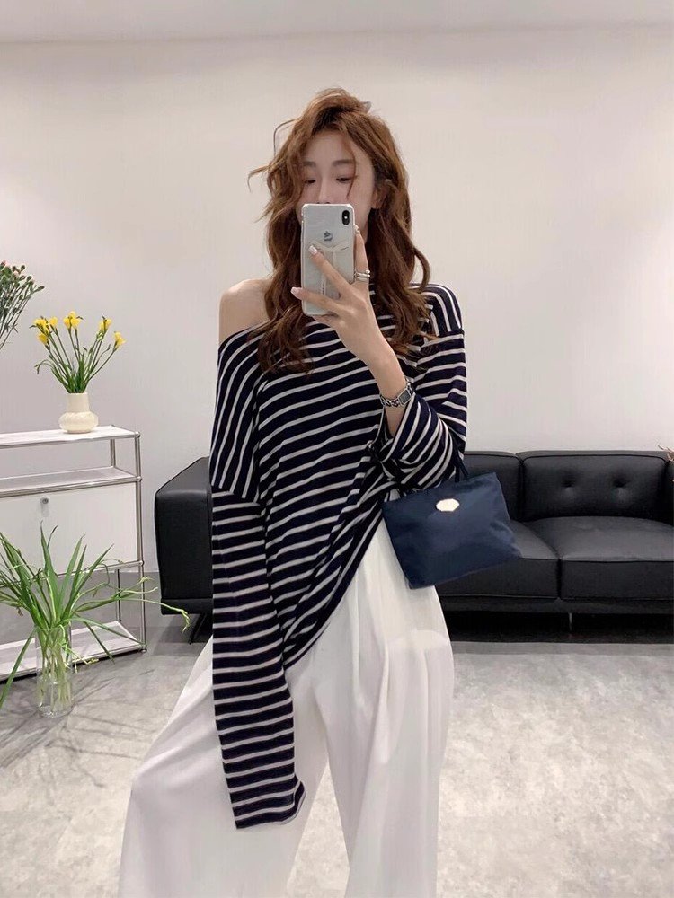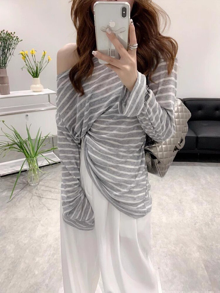 韩系灰色条纹斜肩长袖t恤罩衫女夏季吊带外