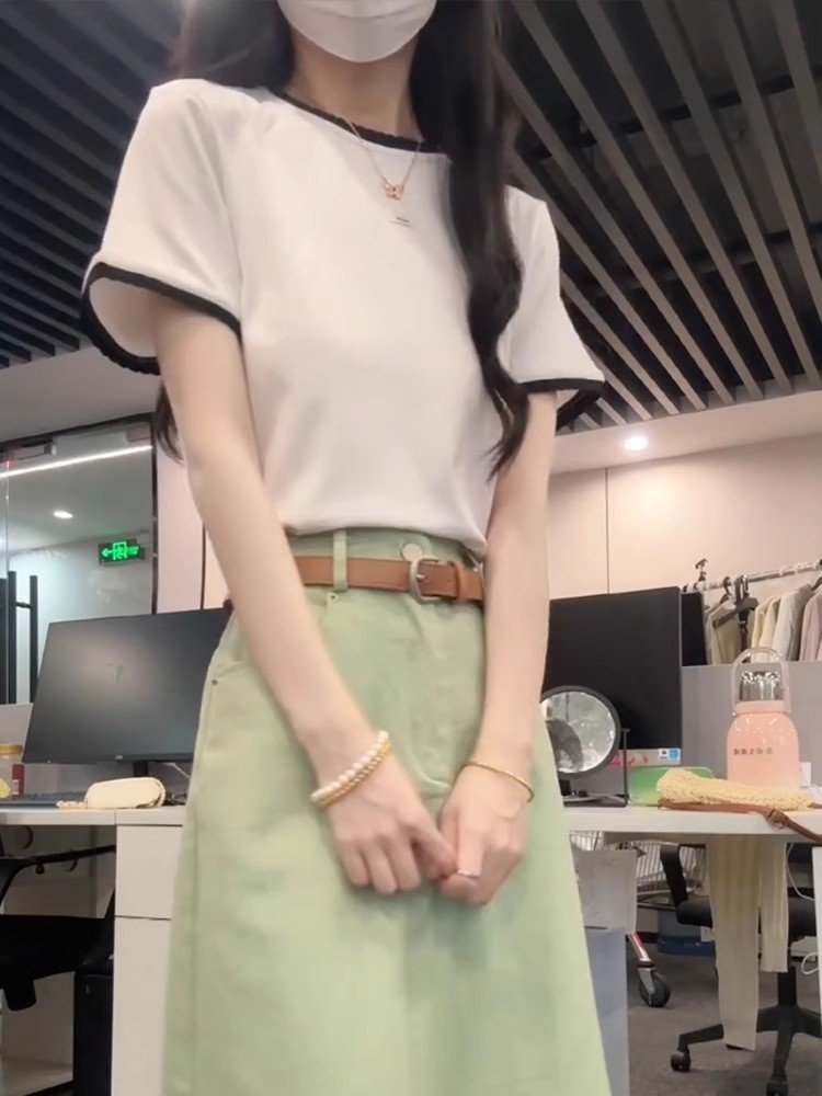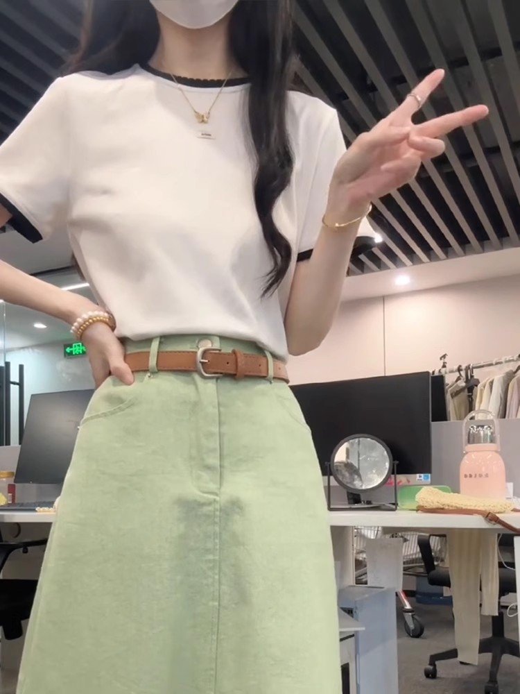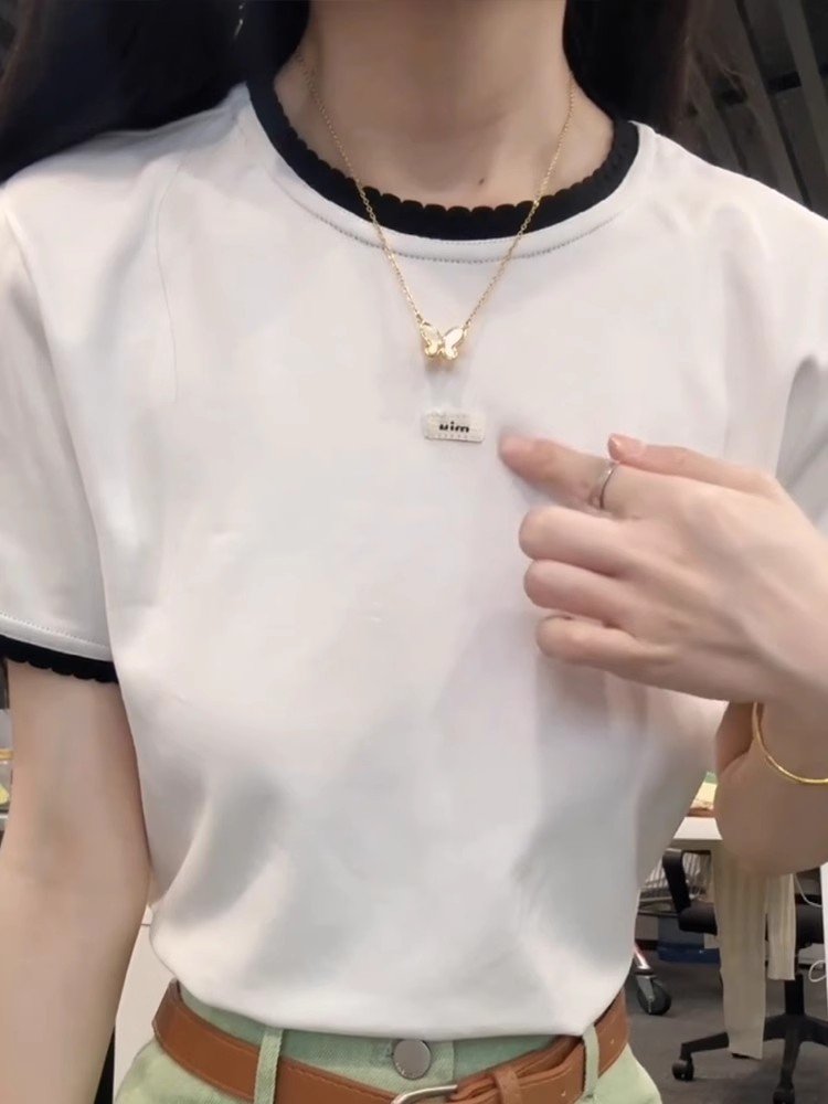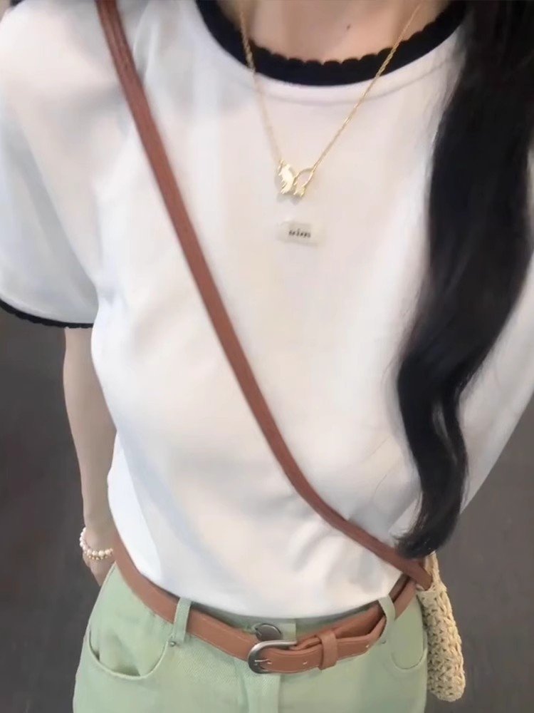 美式复古白色花边圆领正肩短袖t恤女夏季小