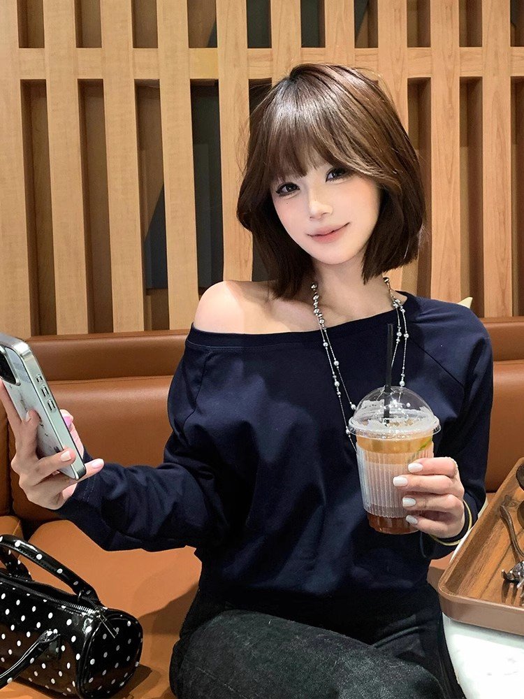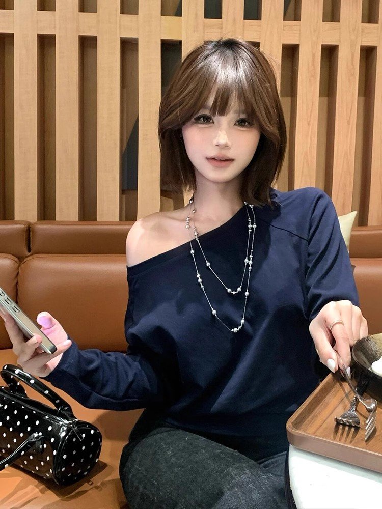 韩系藏蓝色一字肩长袖t恤女春秋季小众设计