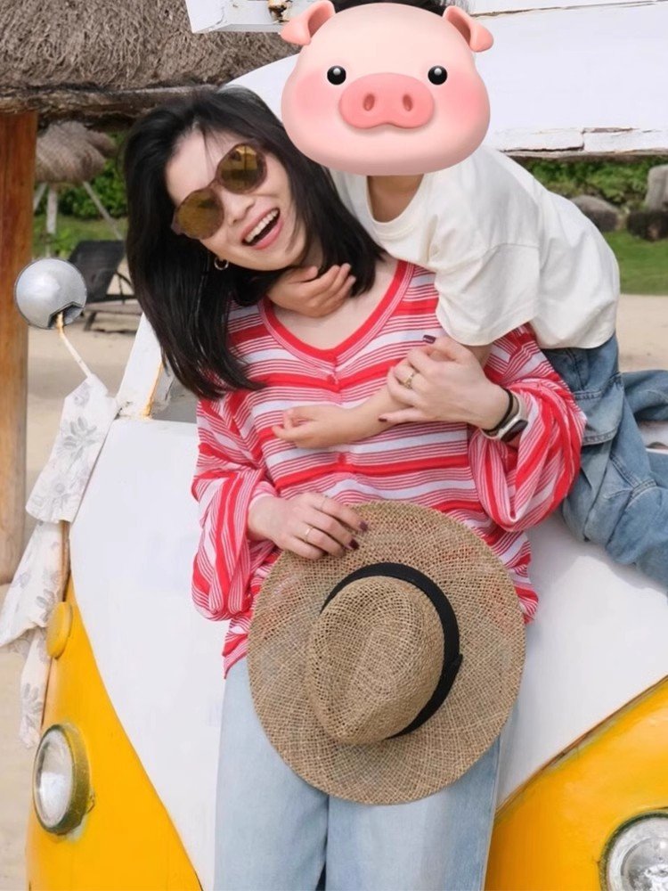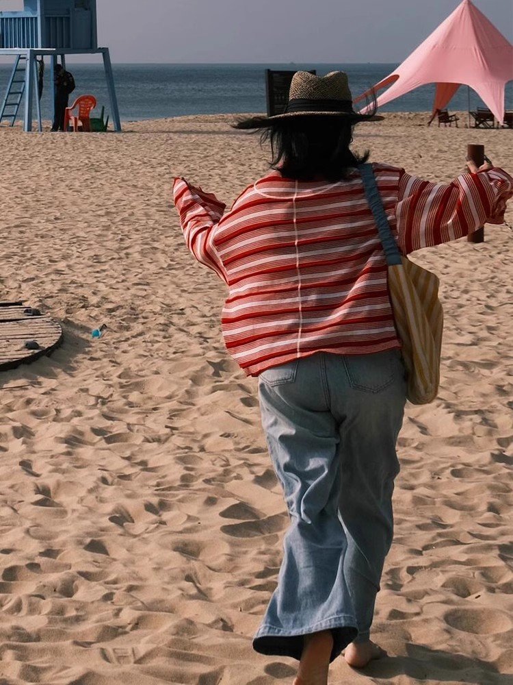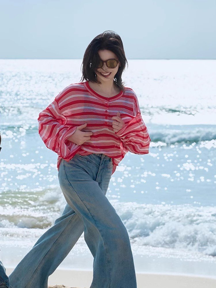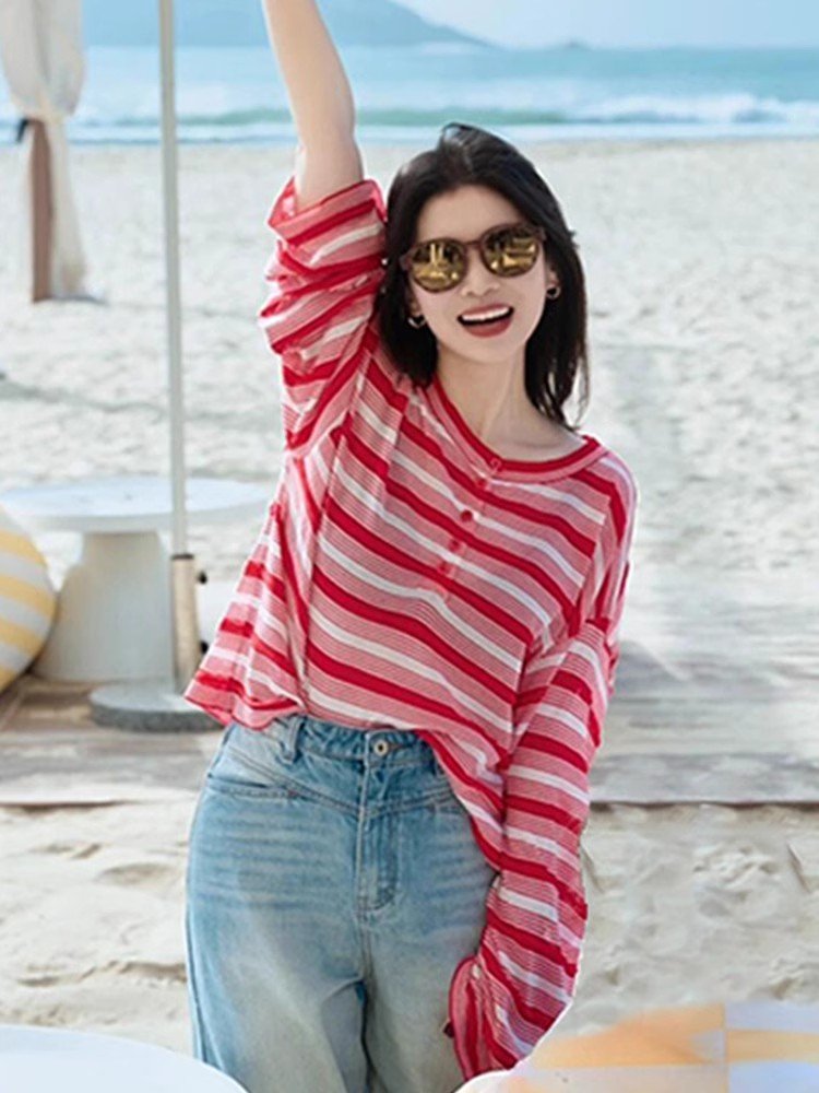韩系红色条纹正肩长袖t恤罩衫女夏季外搭宽