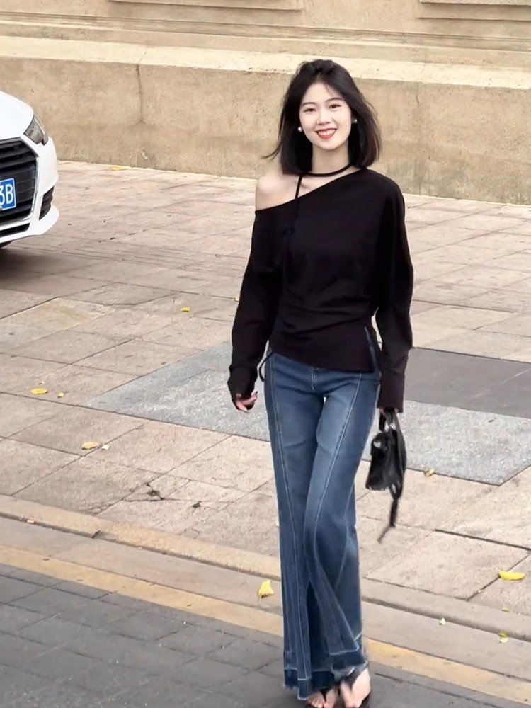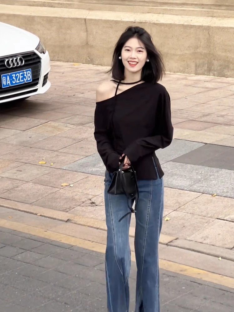 法式内搭黑色斜肩长袖t恤女早春季修身短款