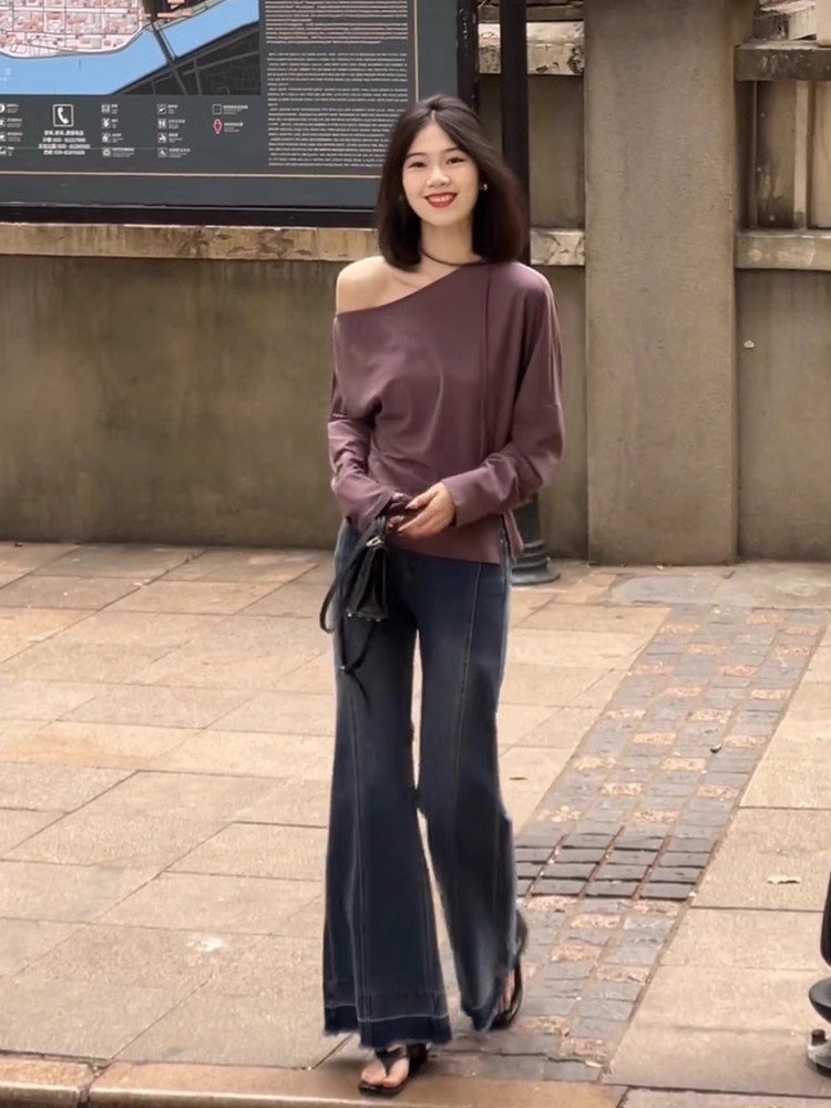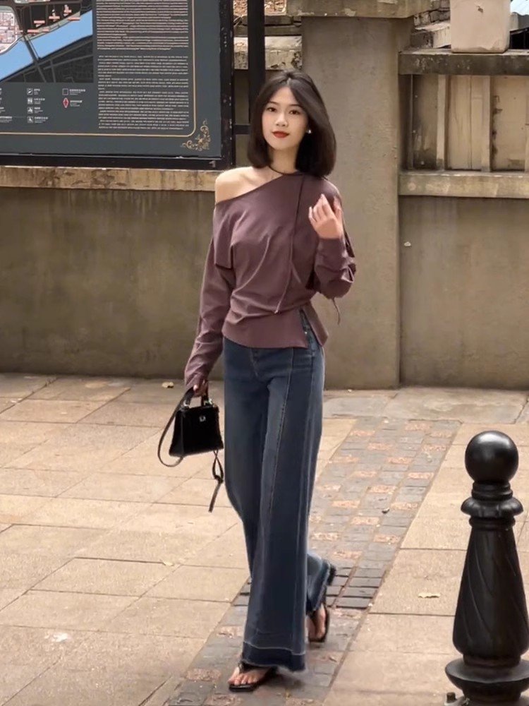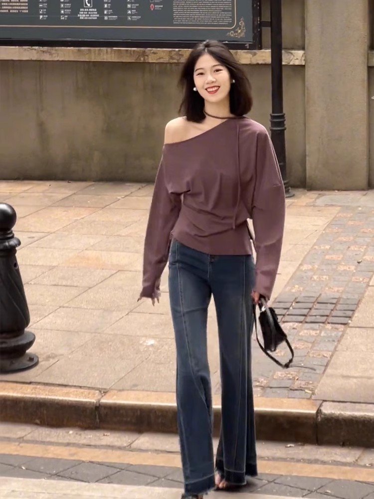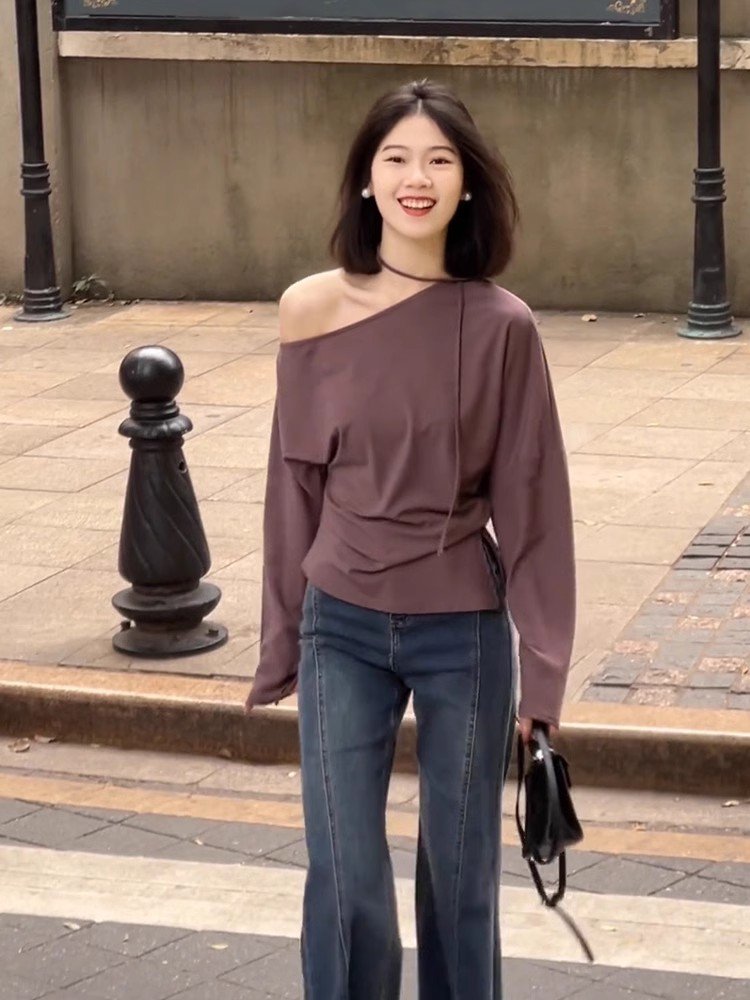 法式短款紫色挂脖斜肩低领长袖t恤女早春修