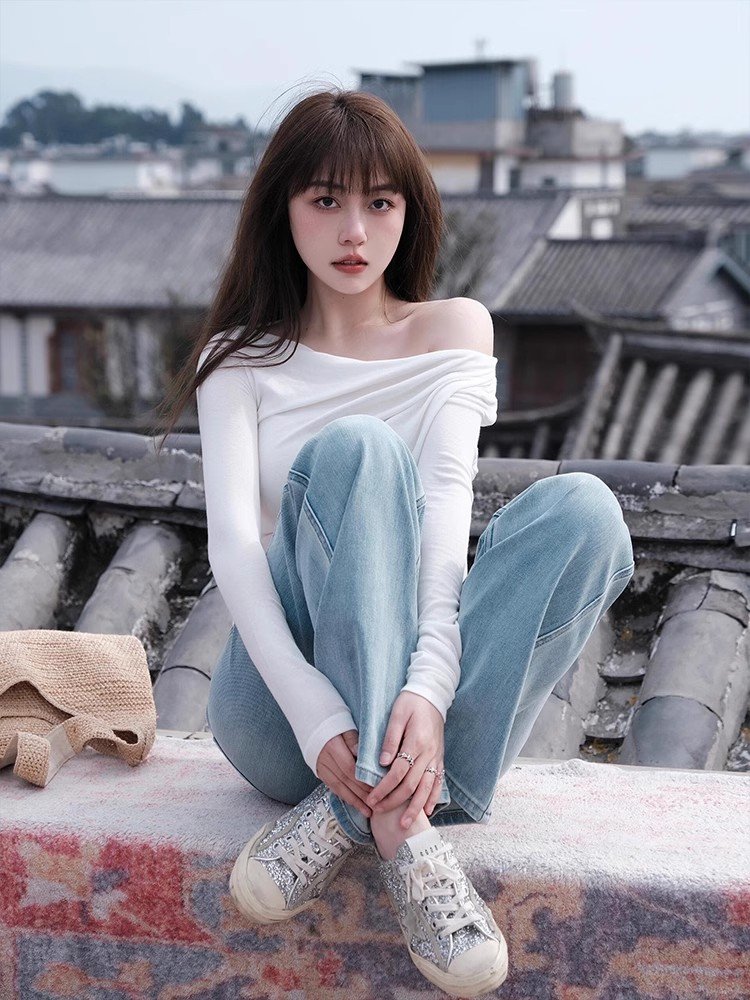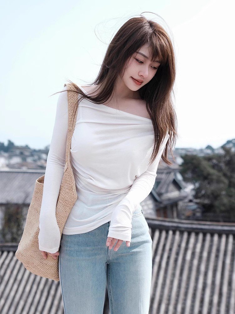 韩系内搭白色一字肩低领长袖t恤女春秋修身