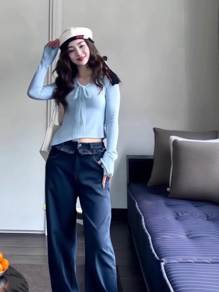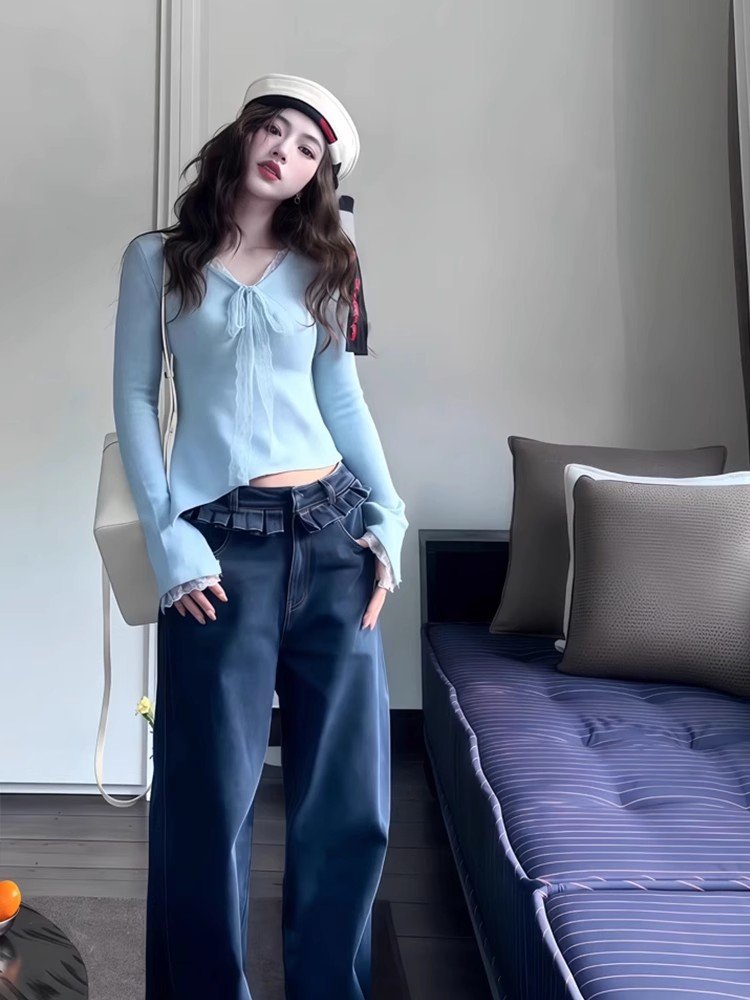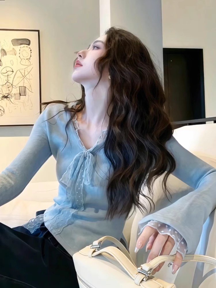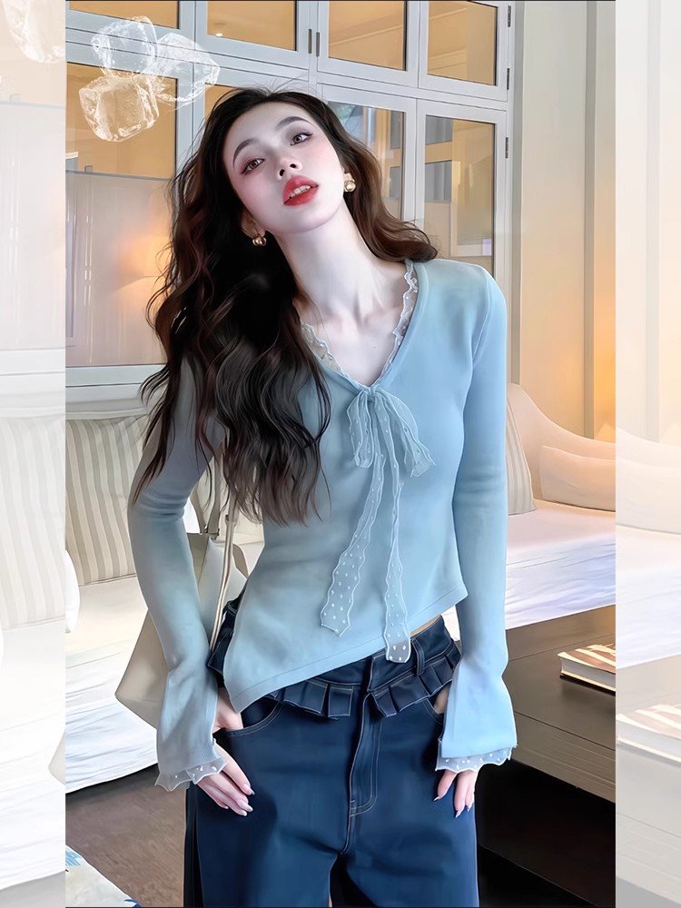 纯欲内搭蓝色蕾丝系带v领长袖t恤女春秋不