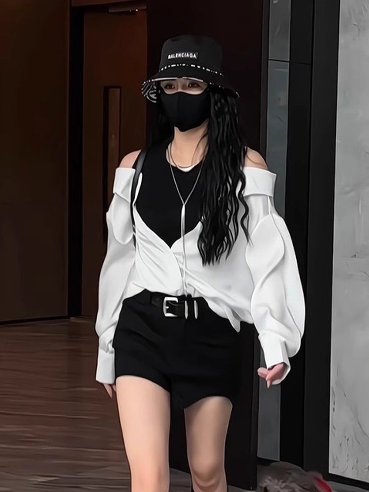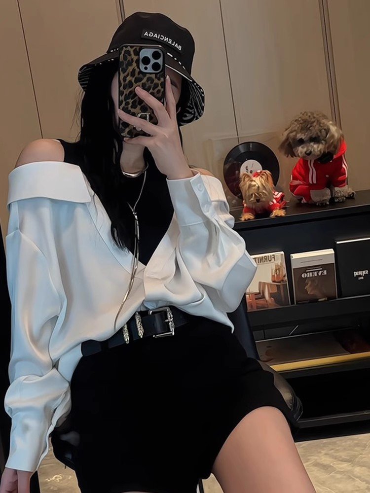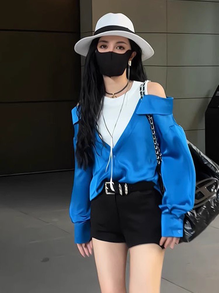 法式蓝色假两件露肩长袖衬衫女春秋季独特漂