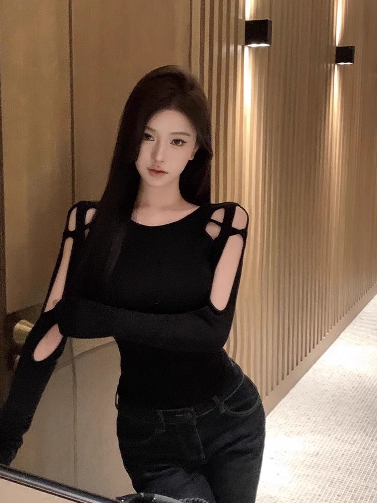 美式辣妹黑色镂空正肩长袖t恤女春秋高腰短