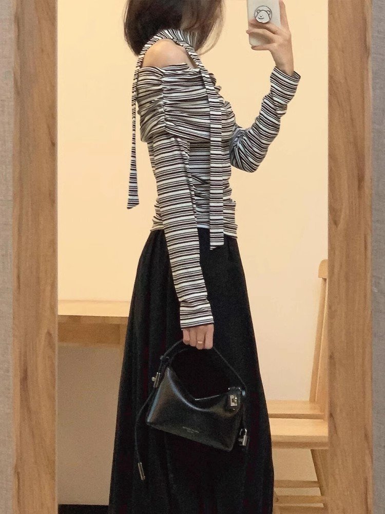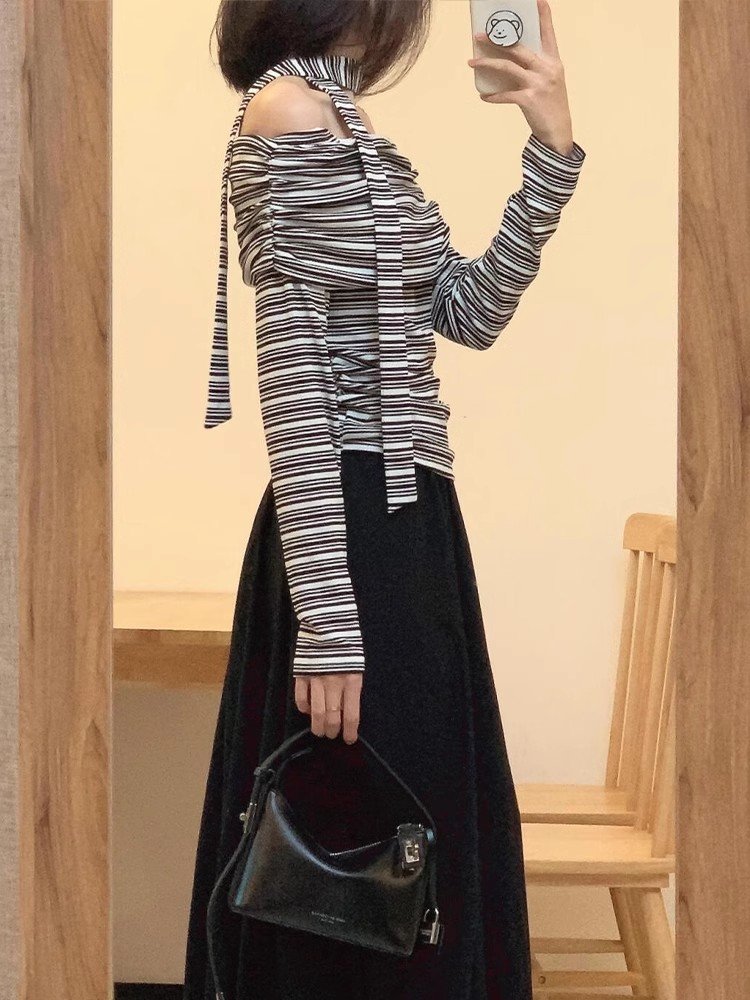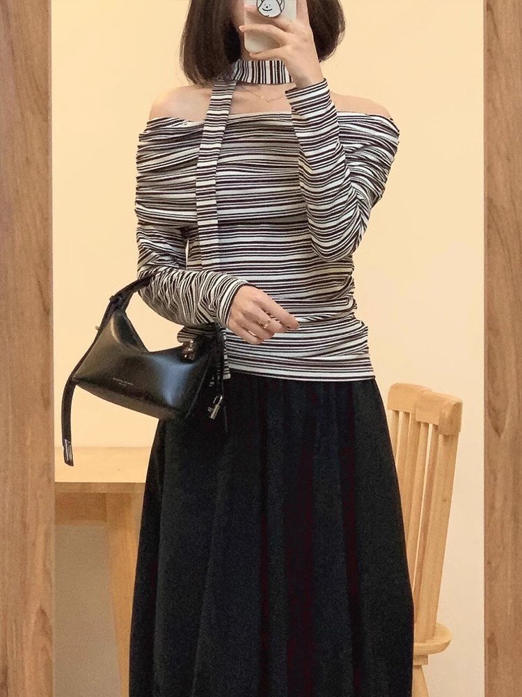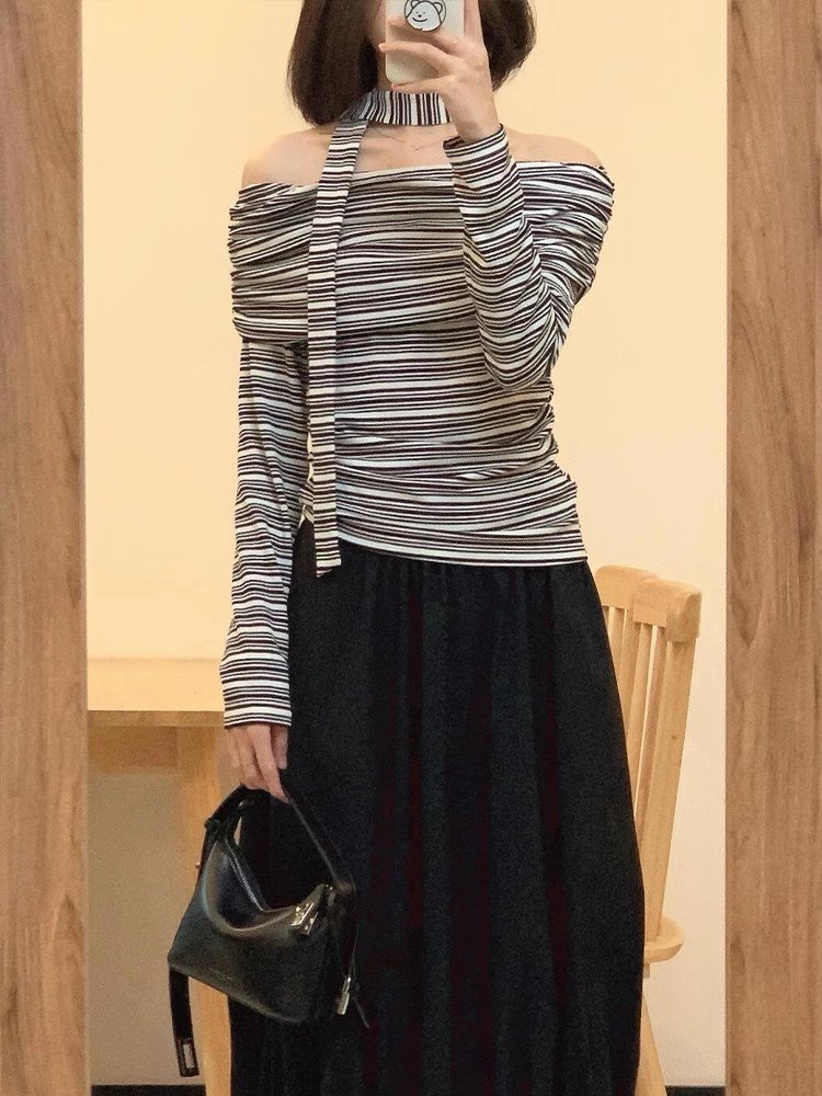 法式黑白条纹挂脖一字肩长袖t恤女春秋季修