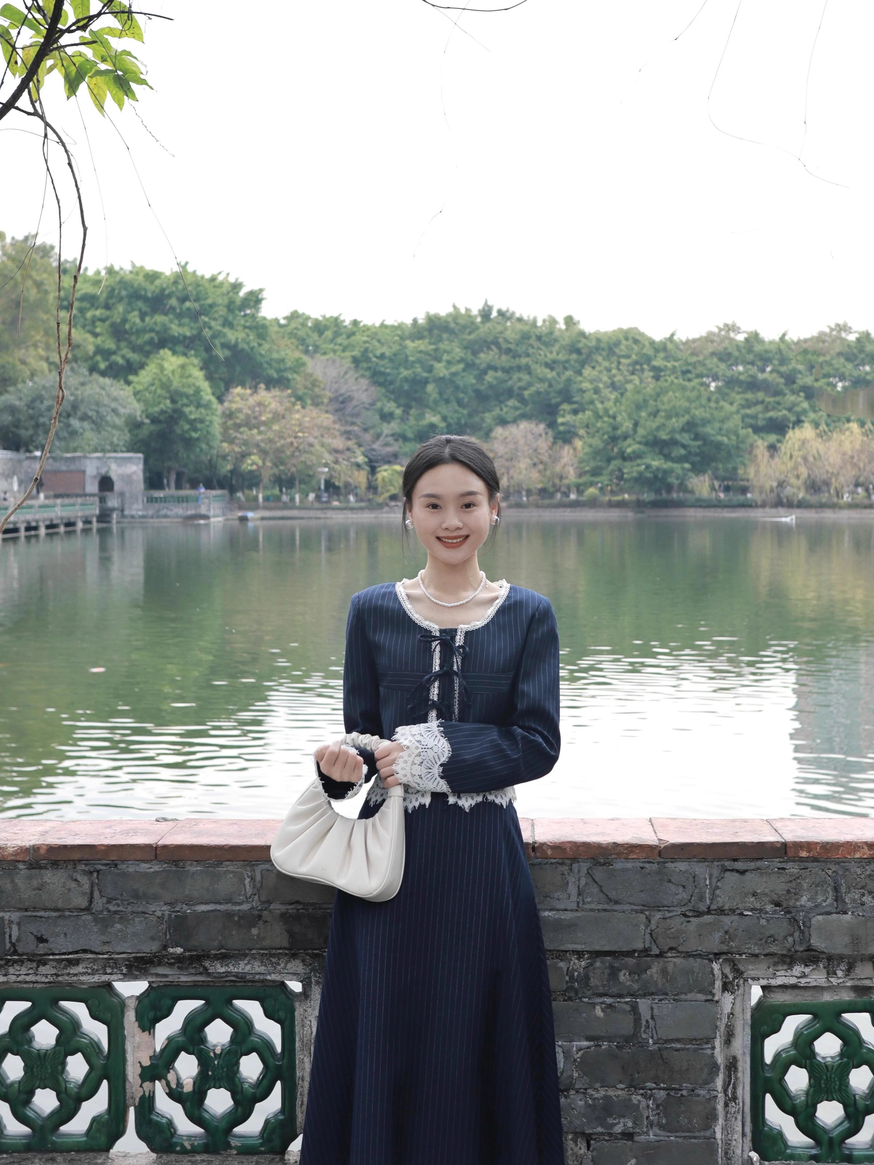 2025新款超火蓝色条纹连衣裙子法式御姐长裙开春季穿搭一整套装女