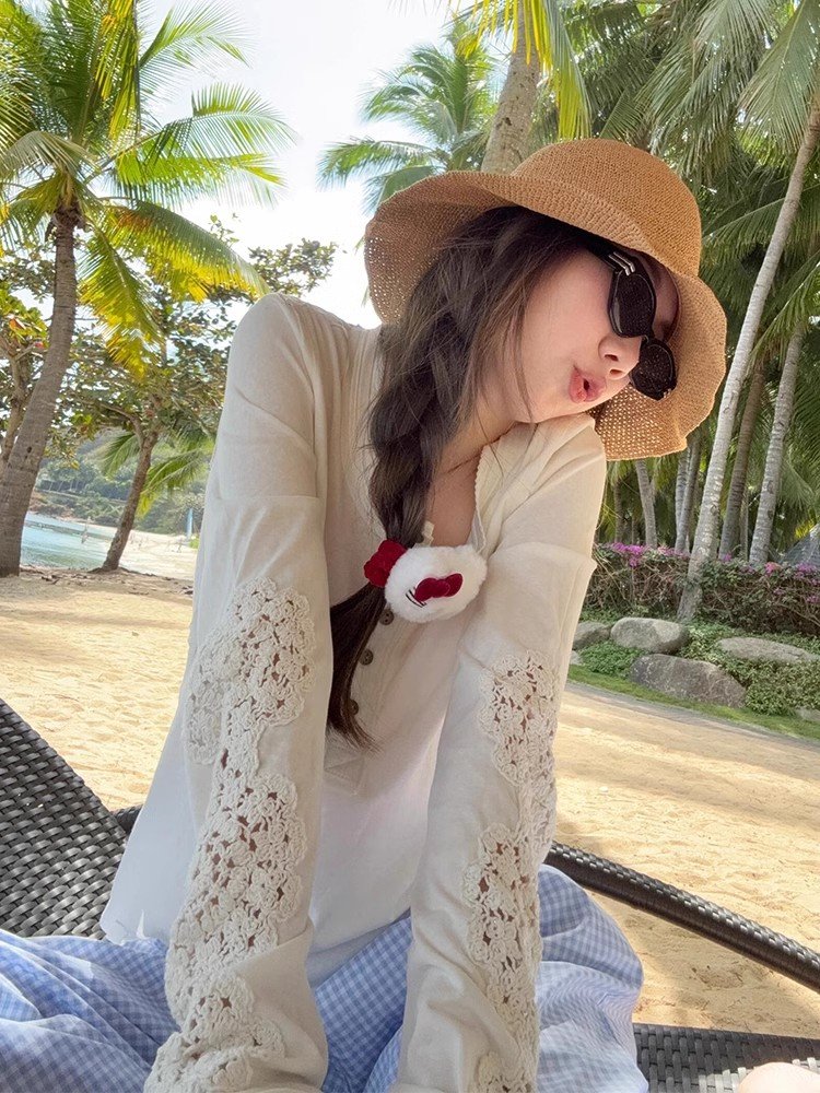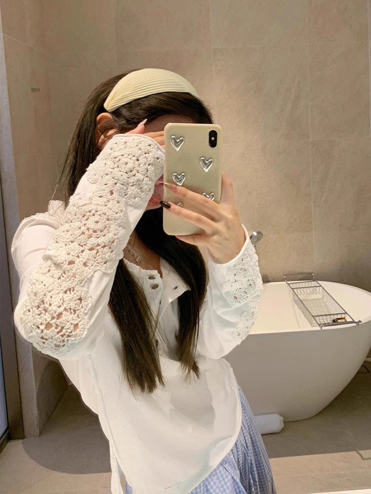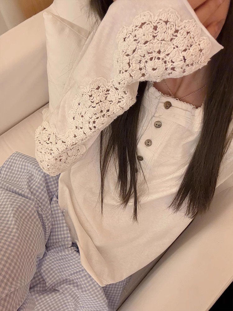 白色不规则镂空钩花针织长袖t恤女春秋季慵