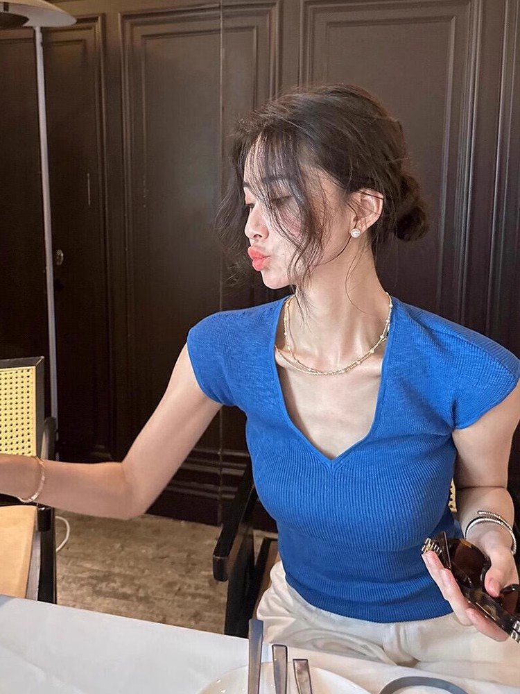 法式黑色冰丝v领飞飞袖短袖针织t恤女春秋