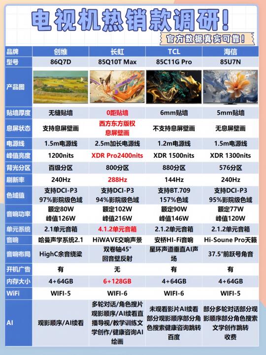 大牌电视机火热产品,产品数据调研,参数一目了然。
