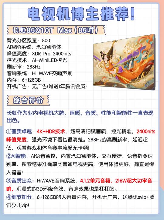 小欧在最后还为大家精心挑选了一台非常不错的电视——长虹85Q10T Max,卓越的画质、震撼的音效、流畅的游戏体验以及智能化的操作,成为了我家庭娱乐的小伙伴。无论是看电影、玩游戏还是日常娱乐,都能带来无与伦比的享受,画面细腻无卡顿,内置AI智能体,支持语音智控,操作简单便捷。非常值得推荐!