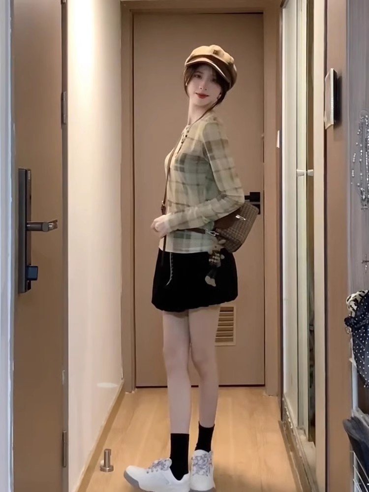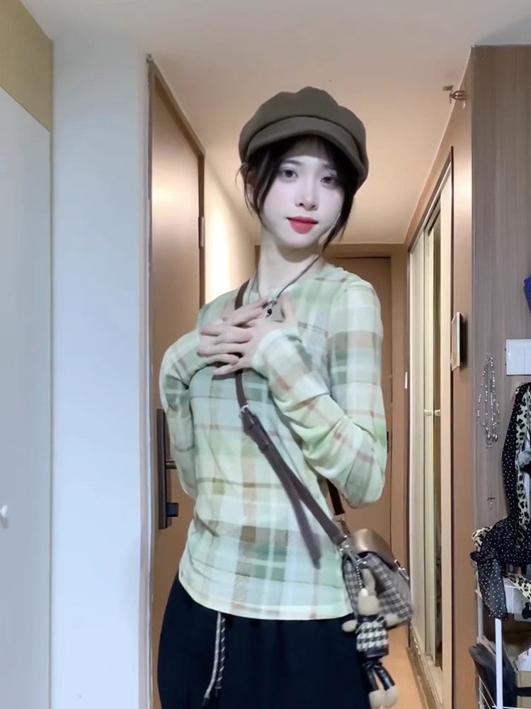 美式复古绿色格子网纱长袖t恤罩衫女夏季吊
