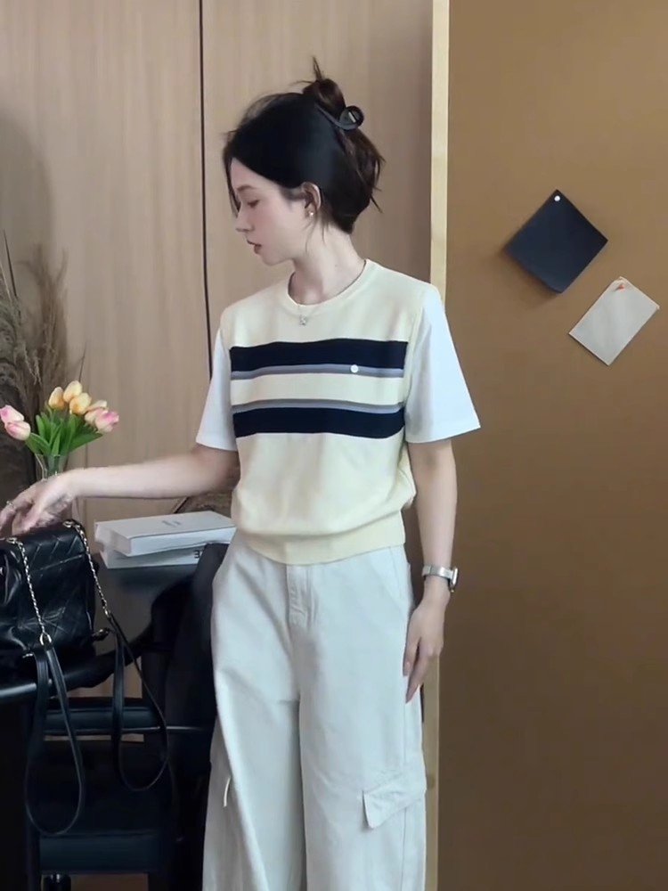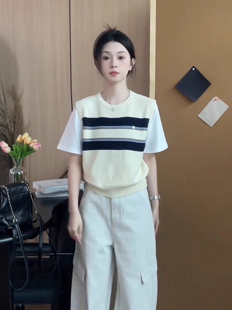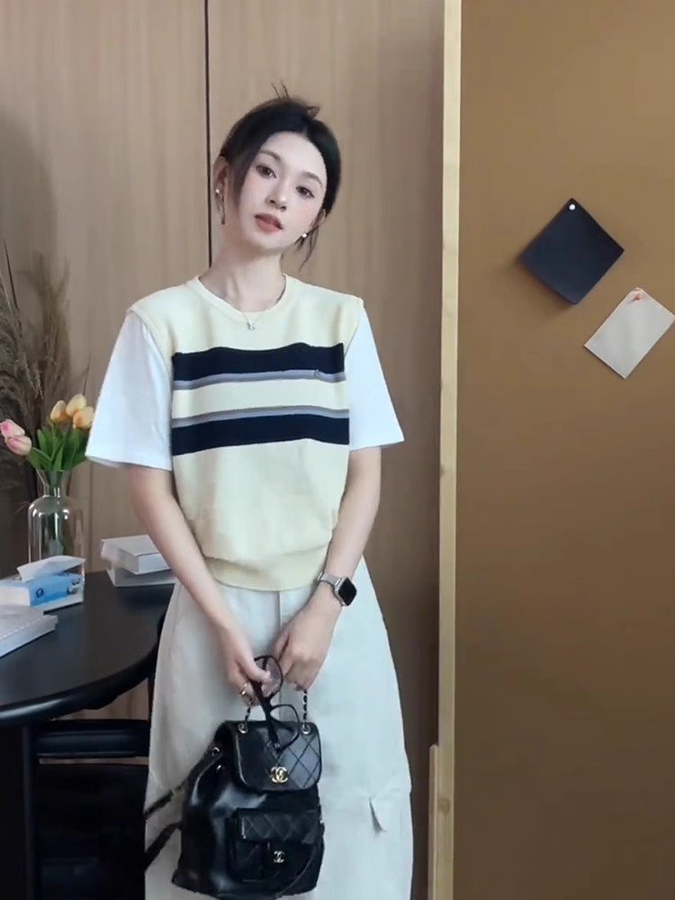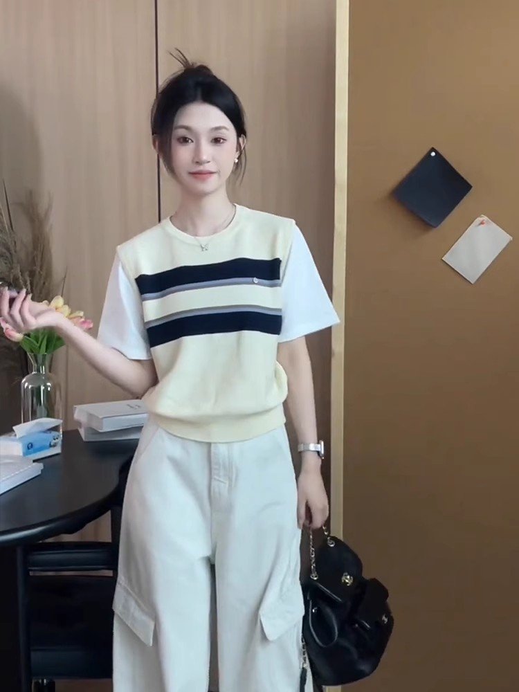 美式复古杏色条纹假两件正肩短袖t恤女夏季