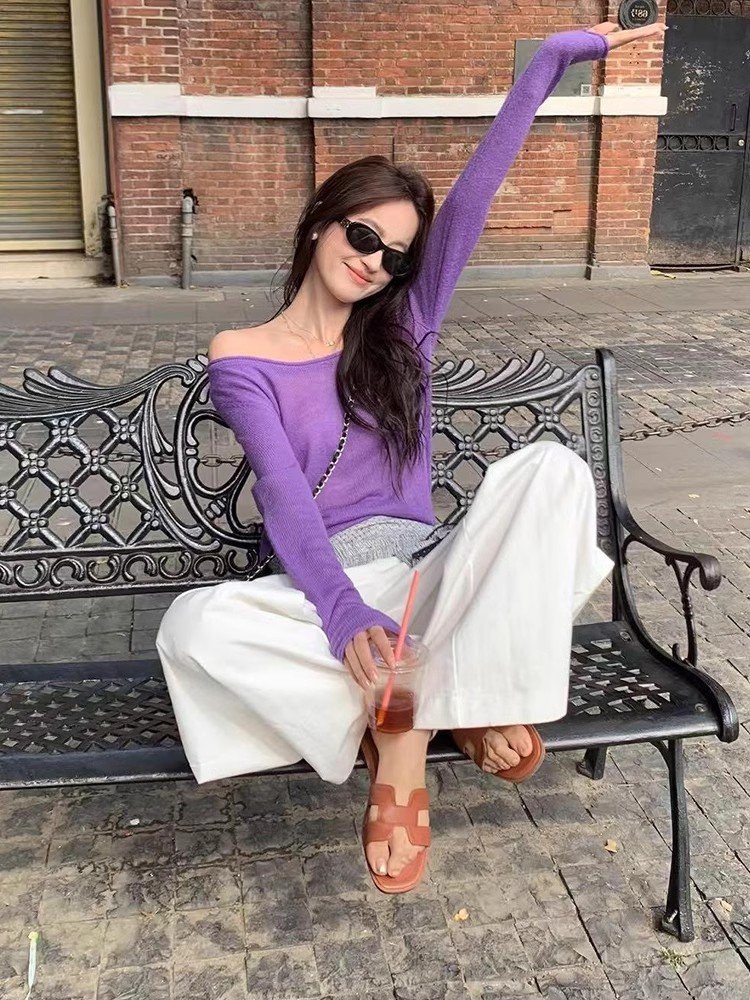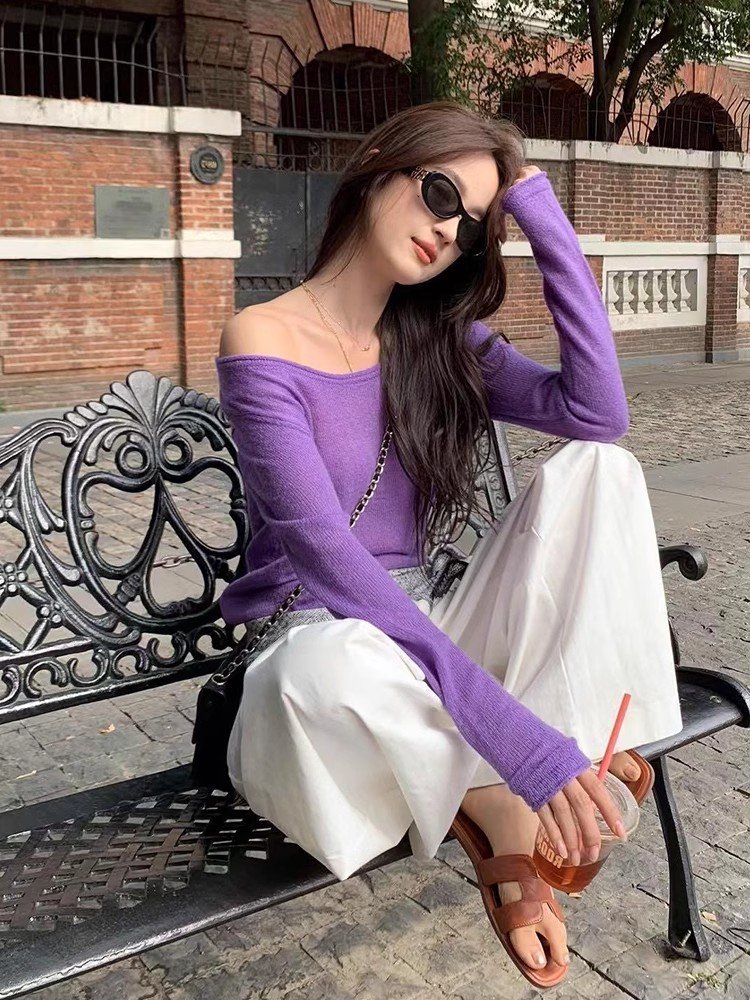 法式紫色一字肩低领长袖针织衫女夏季甜辣小