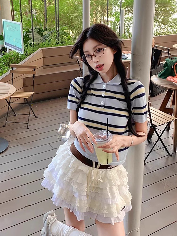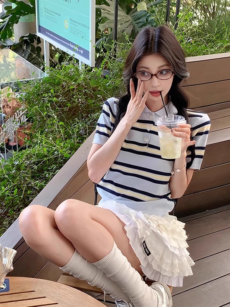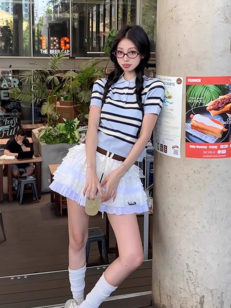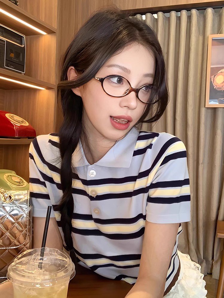 韩系蓝色条纹polo领翻领短袖t恤女夏季