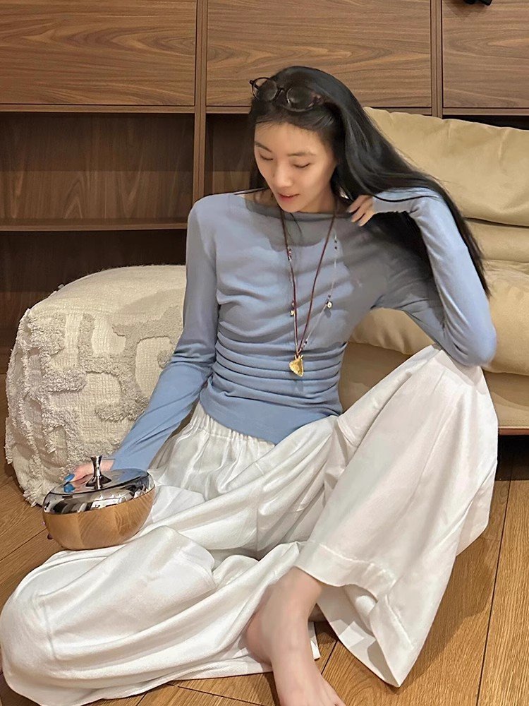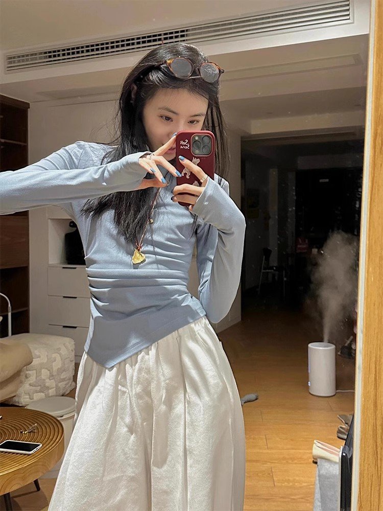 韩系短款蓝色圆领正肩长袖t恤女夏季小个子