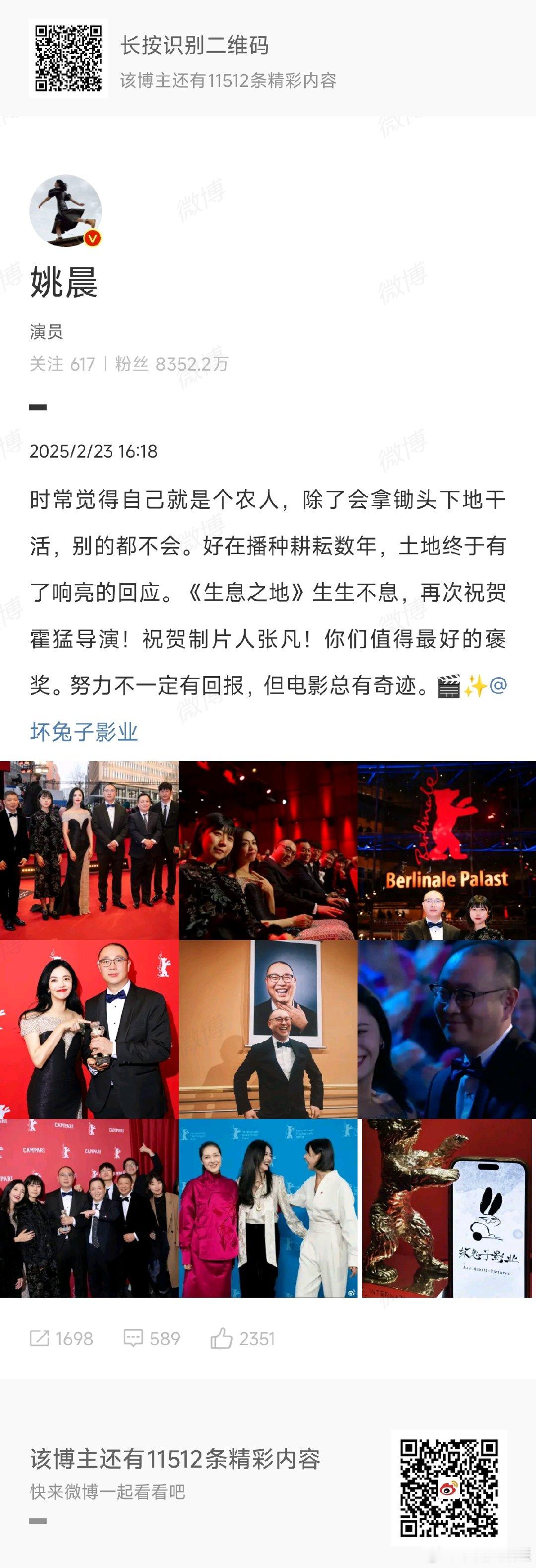 姚晨说电影总有奇迹 姚晨时常觉得自己就是个农人 姚晨闷声干大事,再次祝贺霍猛