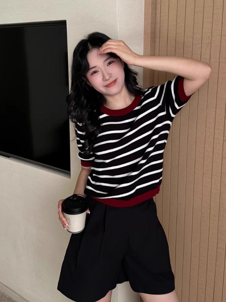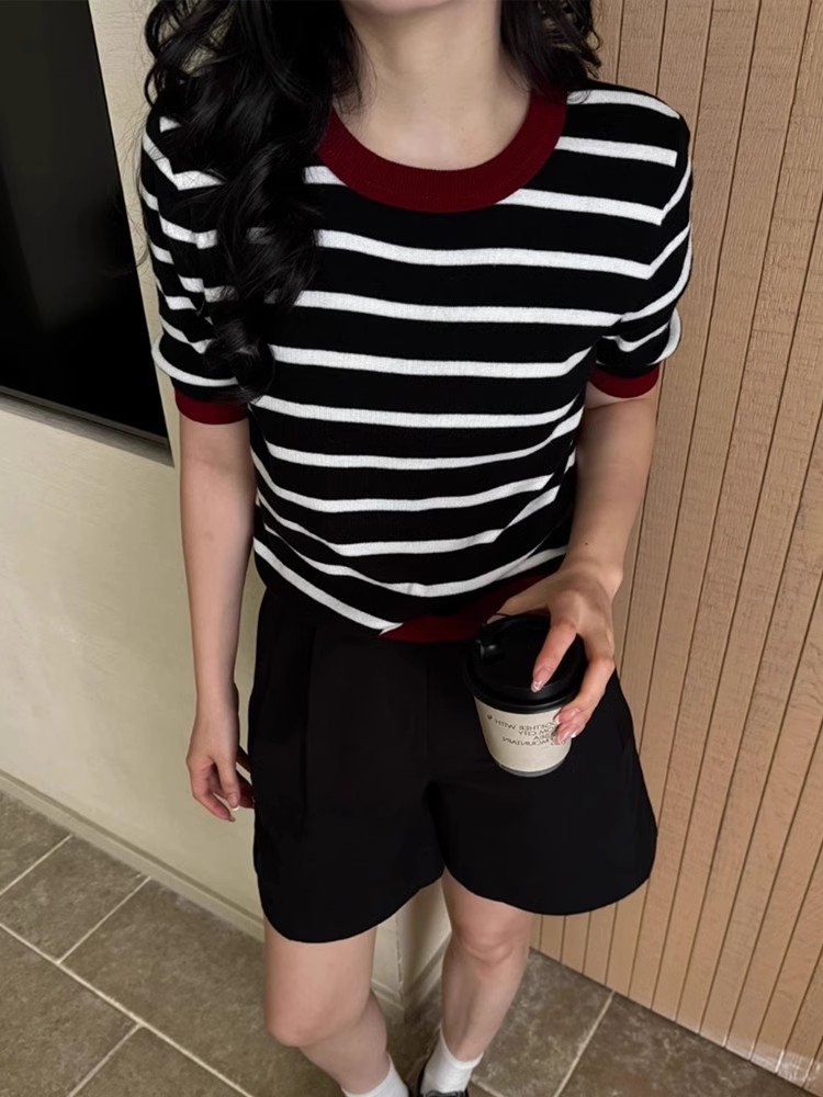 法式别致黑白条纹圆领正肩短袖t恤女夏季小