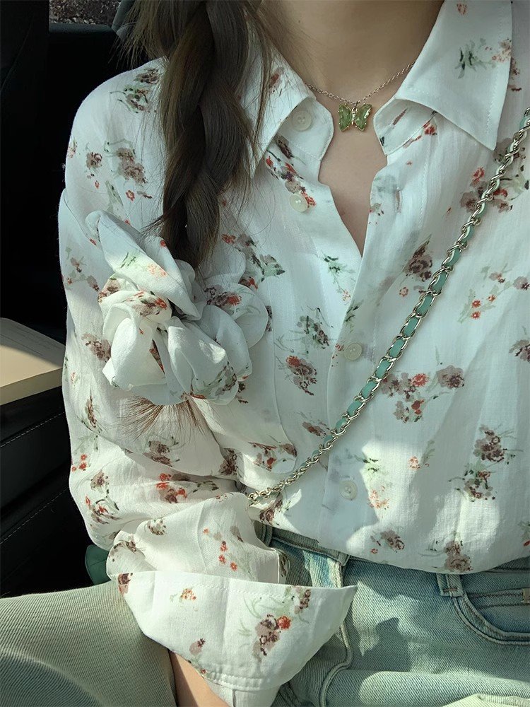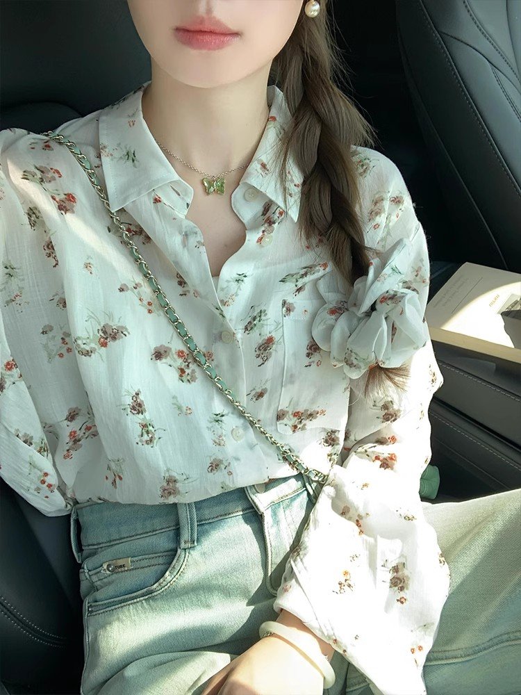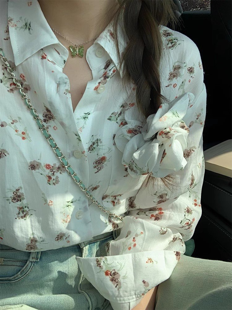法式气质白色Polo领碎花衬衫外套女春秋