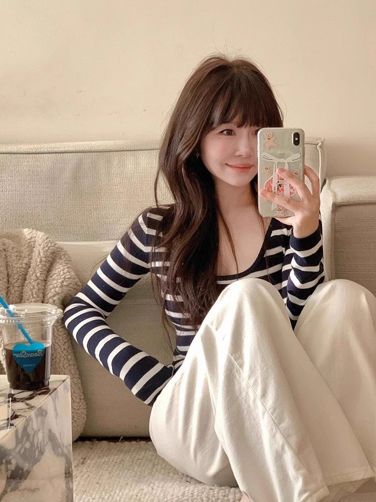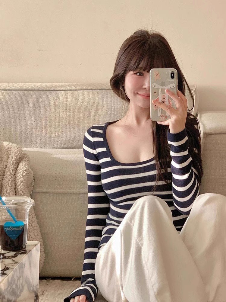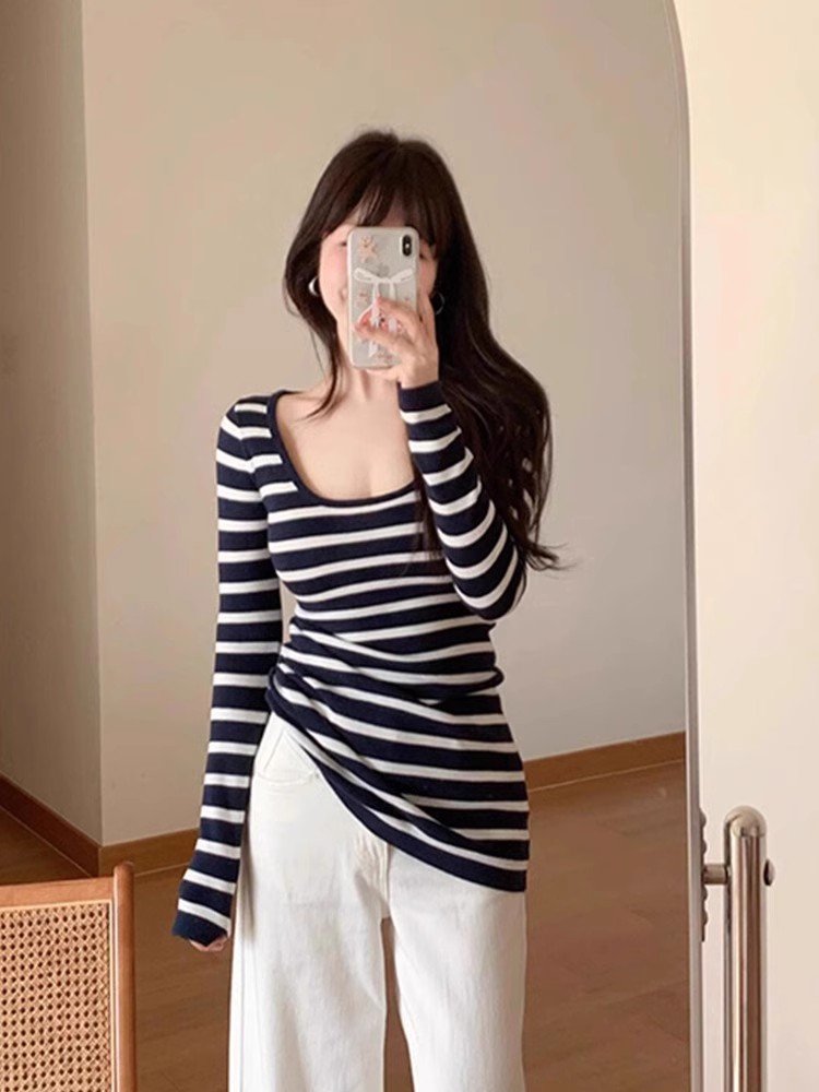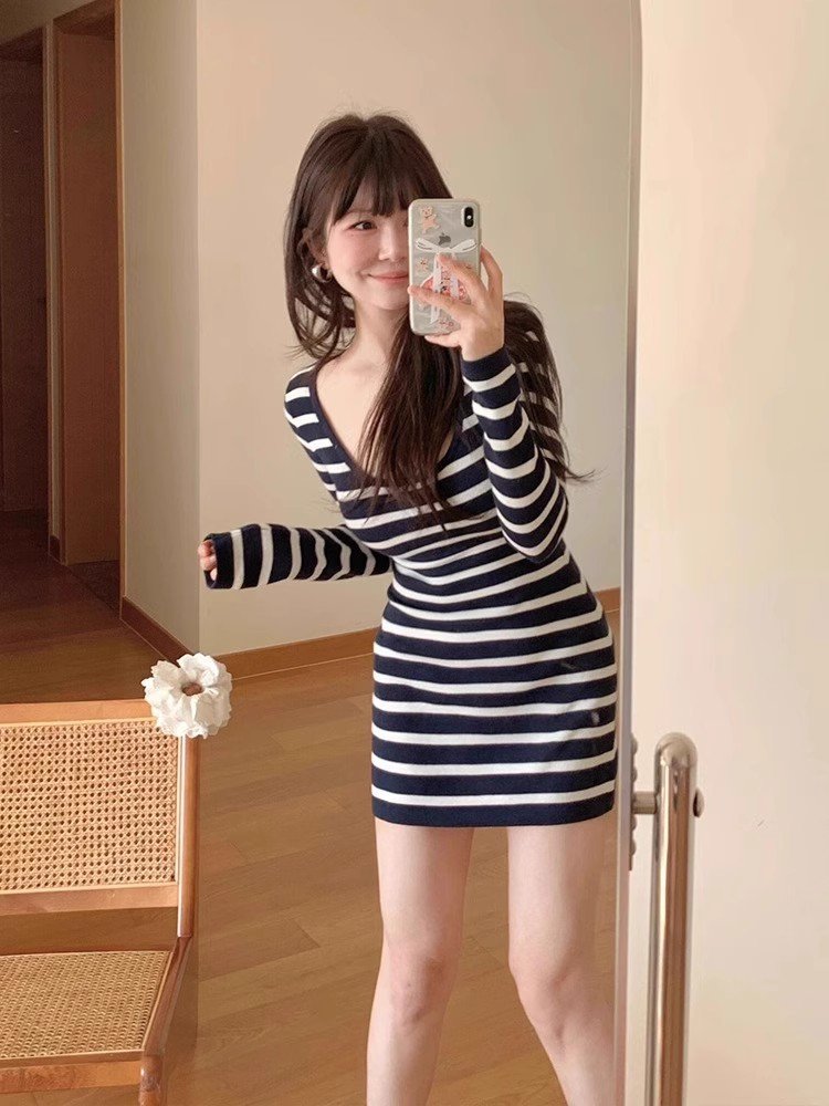 法式气质蓝色条纹方领连衣裙女春秋小个子内