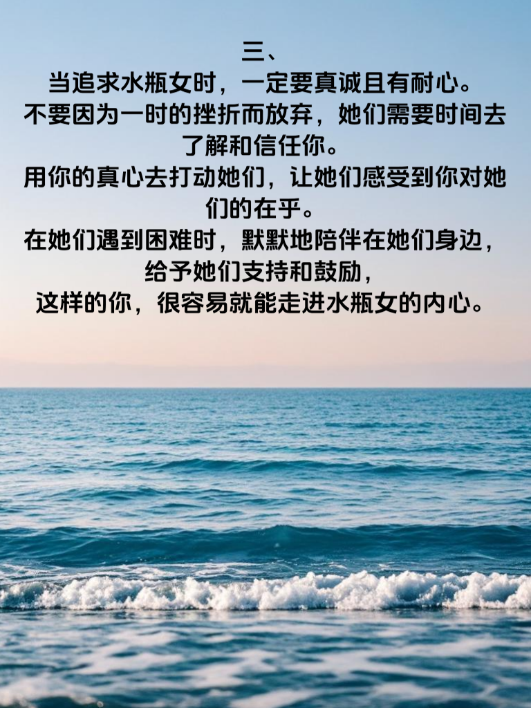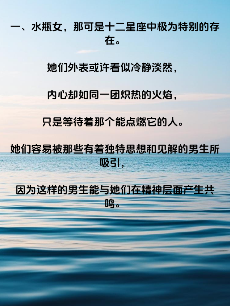 一、水瓶女,那可是十二星座中极为特别的存在。她们外表或许看似冷静淡然,内心却如同一团炽热的火焰,只是等待着那个能点燃它的人。她们容易被那些有着独特思想和见解的男生所吸引,因为这样的男生能与她们在精神层面产生共鸣。 二、男生们要知道,与水瓶女相处,不能过于死板和保守。要展现出自己的活力与创意,带她们去探索那些新奇的事物,让她们感受到生活的多彩。同时,要给予她们足够的空间和自由,不要试图去束缚她们的思想和行为,因为水瓶女最讨厌被束缚。 三、当追求水瓶女时,一定要真诚且有耐心。不要因为一时的挫折而放弃,她们需要时间去了解和信任你。用你的真心去打动她们,让她们感受到你对她们的在乎。在她们遇到困难时,默默地陪伴在她们身边,给予她们支持和鼓励,这样的你,很容易就能走进水瓶女的内心。