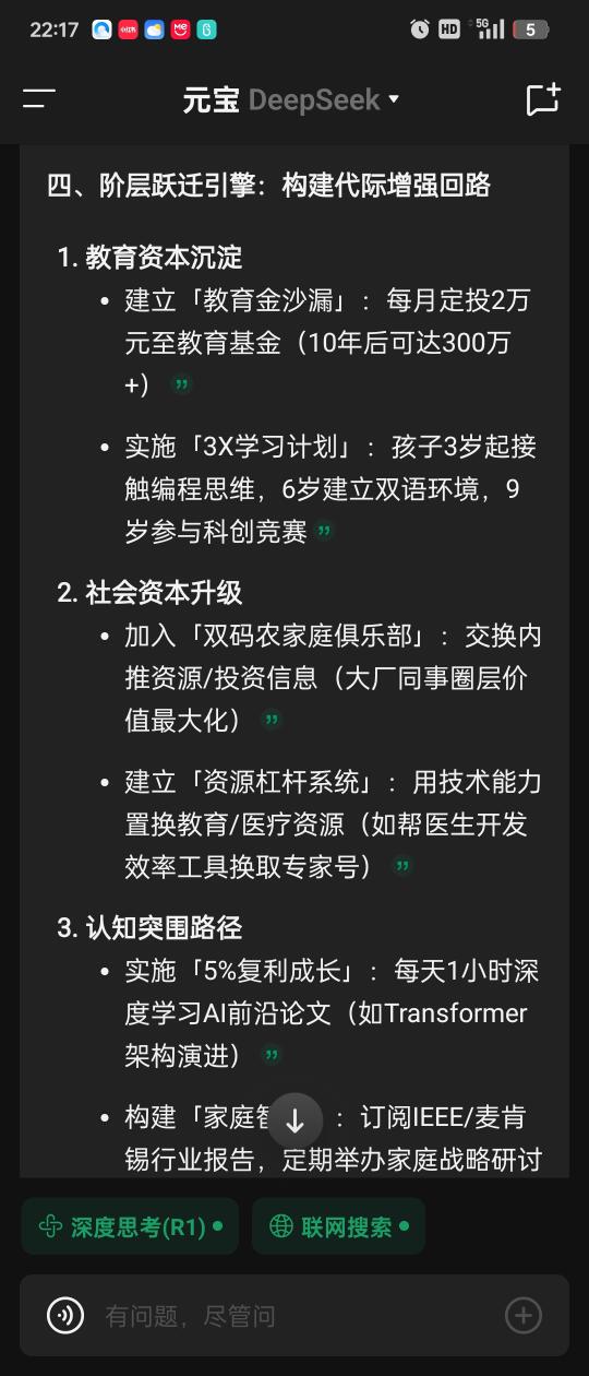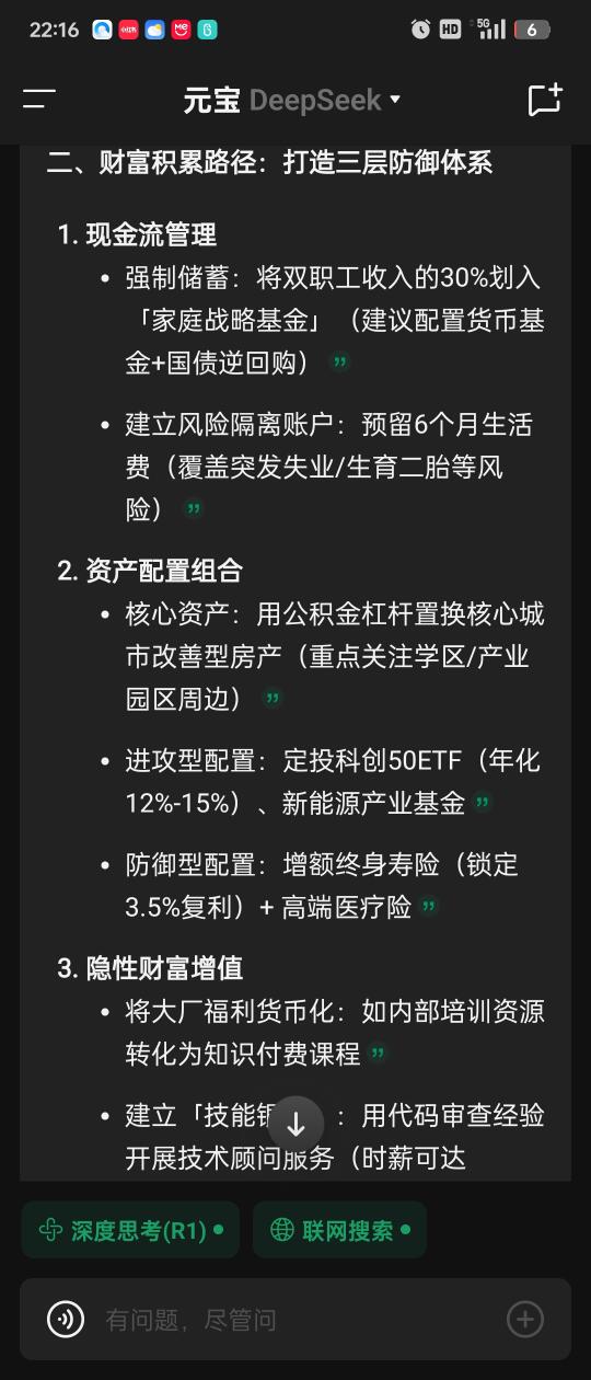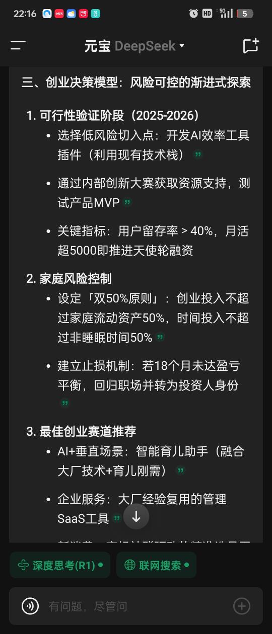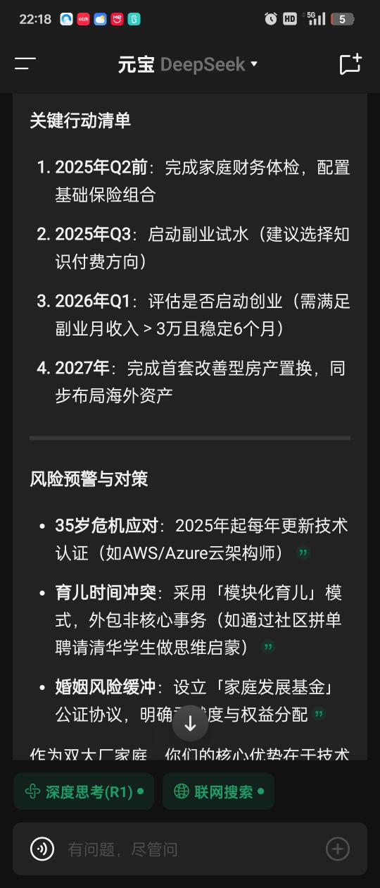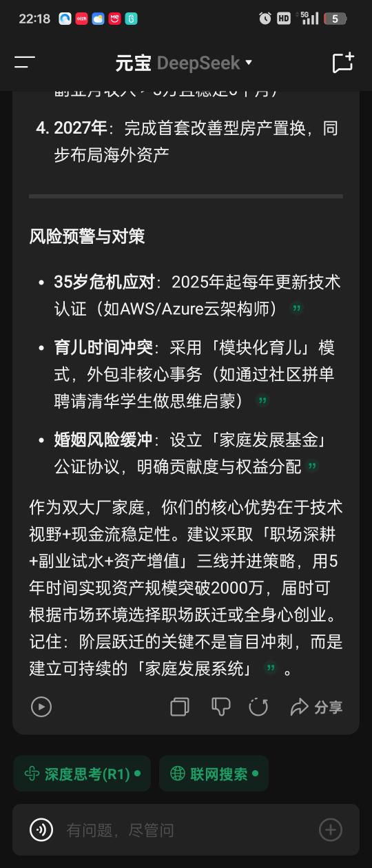 原问题: [向右R]我是35岁大厂新手妈妈,老公同大厂32岁青年管理,我要如何规划接下来的工作和生活,如何建立财富,是否要考虑创业,家庭如何完成阶级跃迁 [打卡R]元宝deepseek从深度思考加联网分析给出的解答 逻辑清晰,具备可行性,AI连家庭生活,工作规划,财富发展都能给出这么清晰的建议,确定不容小觑 最近做案例接触到了一些AI科技行业创业者,时代的洪流发展如此迅速,感叹自己正在经历的一切