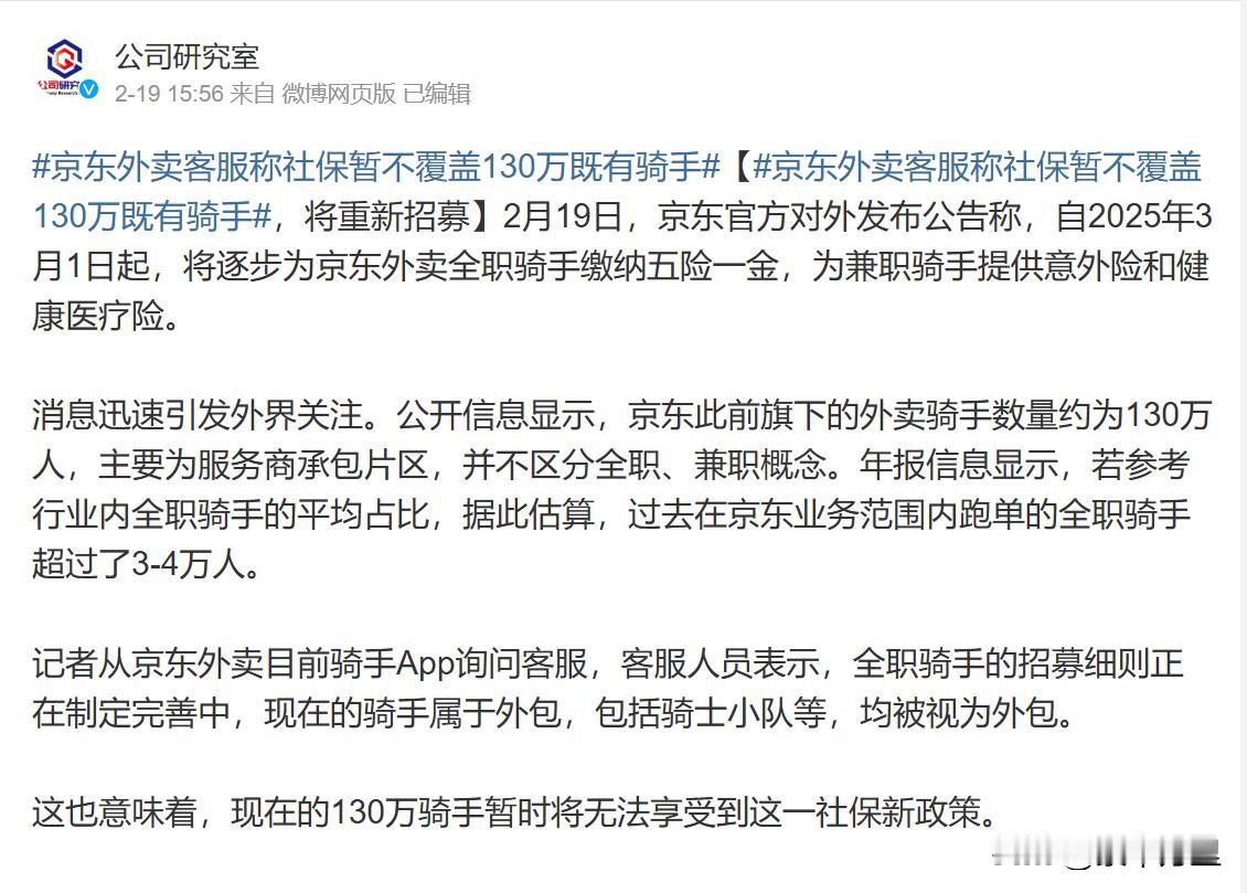 京东骑手社保高调登场,本是一件值得庆贺的好事,但现有的130万骑手却直摇头! 前几天,京东“为骑手交社保”的公告一出,就立刻引发了全网的热议,“改革先锋”、“行业破局者”……称赞不绝于耳。说实话,我刚听说时也颇为震惊,可等我再仔细端详了一遍公告后,却发觉事情并没那么简单。 首先,京东官宣的是逐步为“全职骑手”缴纳社保五险一金,很多人对这个词没什么概念,以为京东目前的130万骑手都能享有,但实则不然。据《海南特区报》披露,其现有骑手多为众包模式,全职骑手仅有3-4万人。 但媒体调查发现,即便是这3-4万的全职骑手也被爆出与平台并非雇佣关系,亦无法享有京东社保新政,此次社保政策仅针对未来新招募的约1万名“全职骑手”。这意味着,当前支撑京东配送业务的现役骑手群体,无论工作强度如何,均被排除在五险一金范围之外。 如今来看,京东这波“语言艺术”着实迷惑住不少网友。但要我说啊,企业玩商战搞噱头咱理解,可拿基层骑手当“人肉广告牌”就太寒碜了。现在全网铺天盖地夸京东“开创行业先河”,结果数百万骑手日盼夜盼的社保心愿,到头来却成了镜花水月,这谁受得了? 最后说句掏心窝的:咱老百姓不看广告看疗效。甭管平台喊得多响亮,谁能把五险一金塞进每个骑手的工资条,谁才是真良心。大家说,是不是这个理儿?