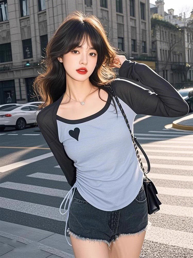 辣妹蓝色刺绣插肩长袖t恤女内搭早春不规则