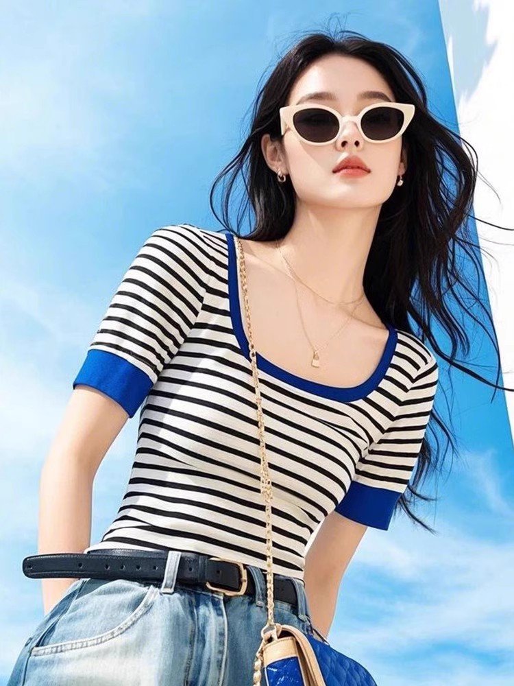今年流行爆款设计感气质修身显瘦条纹拼接上