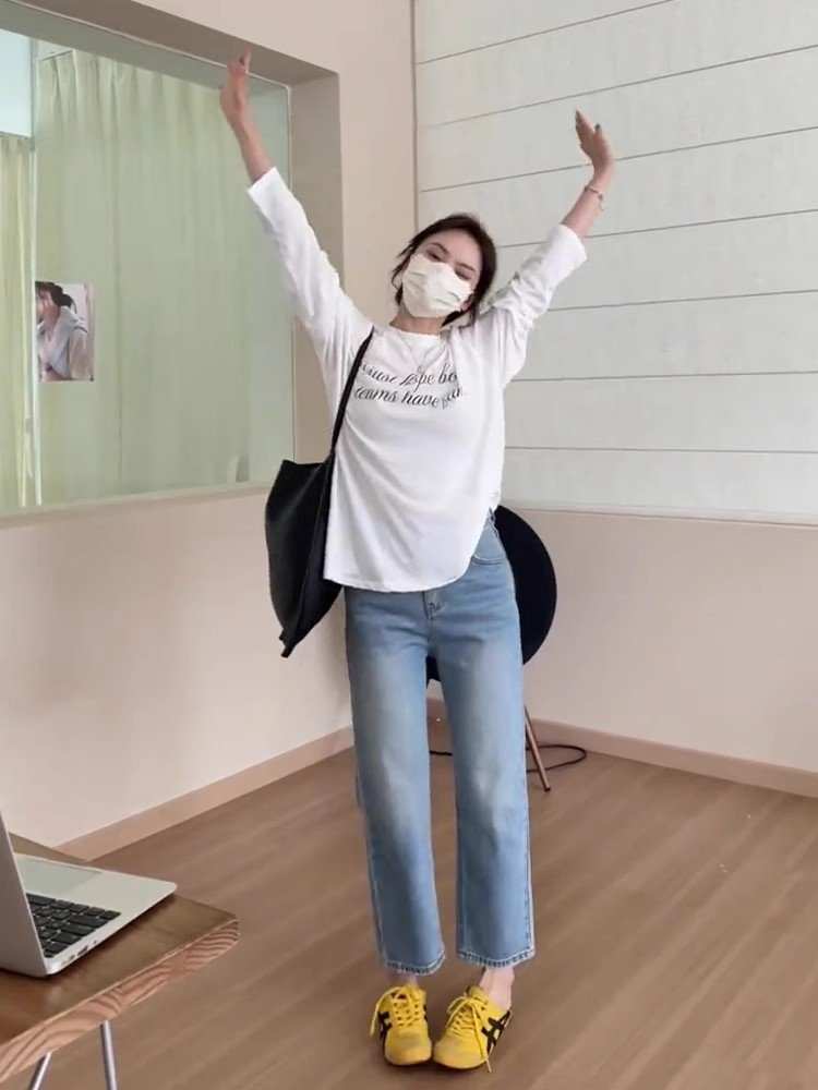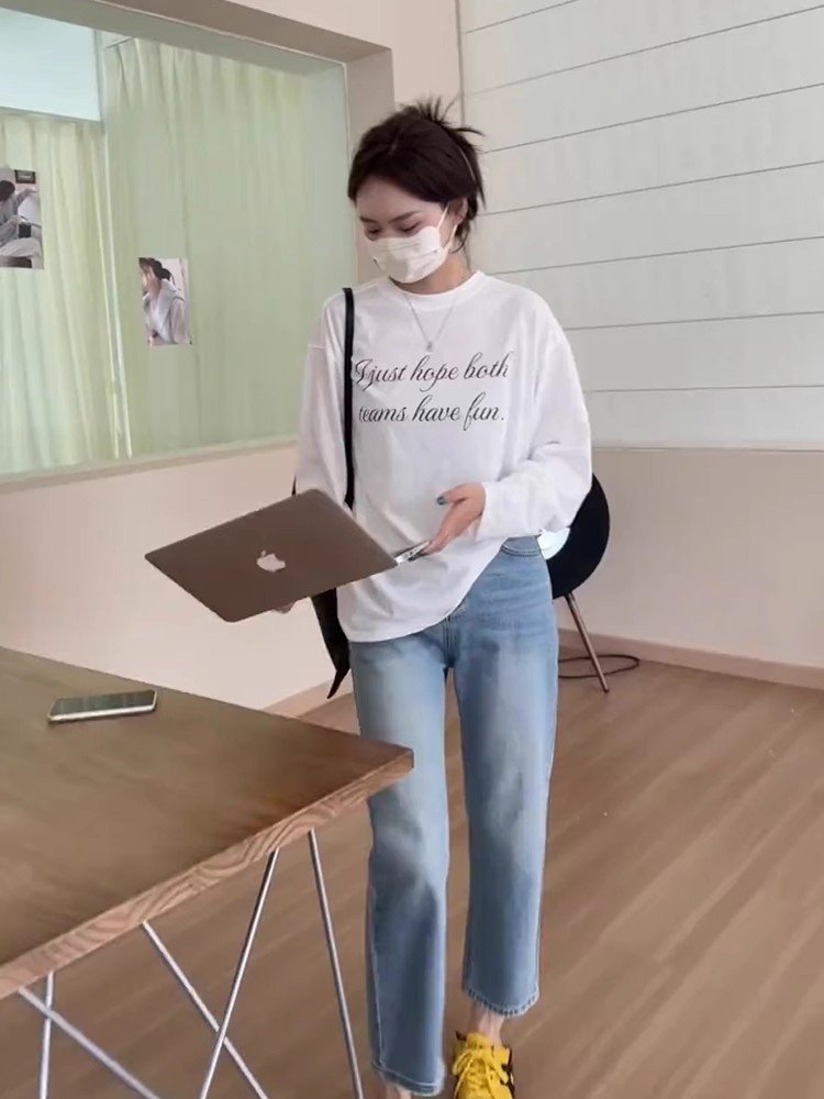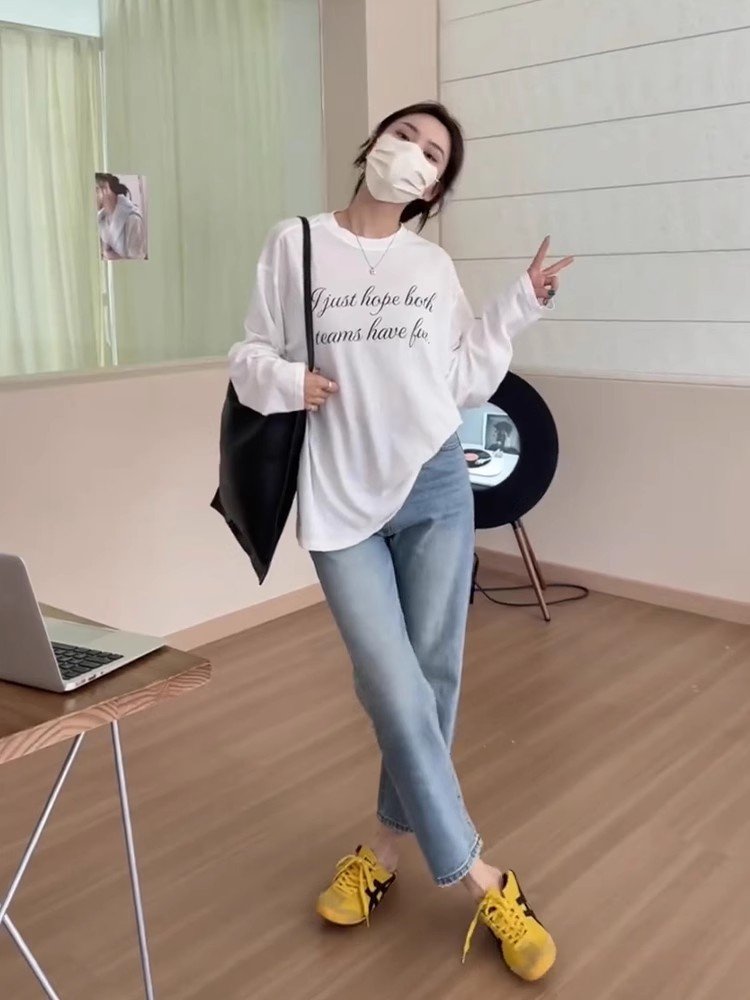 美式复古白色印花圆领长袖t恤女早春外搭宽