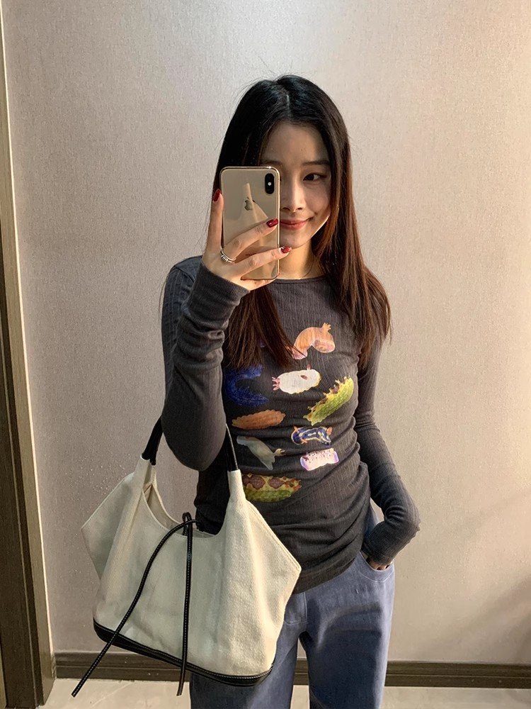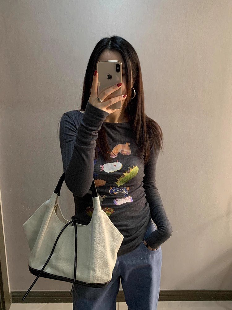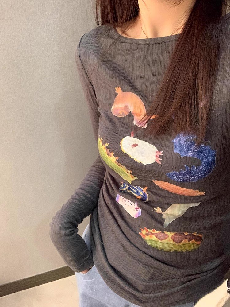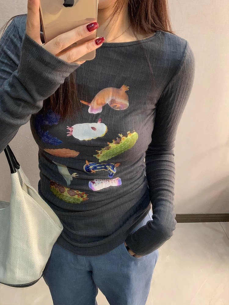 灰色卡通印花长袖t恤夏季小衫女2025新