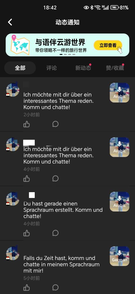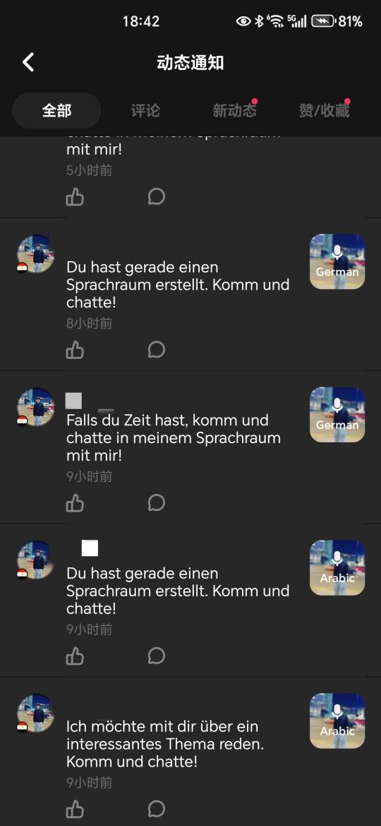 观察我德语说的贼地道的埃及好兄弟平均一天开五小时语聊房(不只是一天,他几乎每天都玩五小时!!!),难怪他德语说的这么好[哭惹R]完全是标准hoch deutsch,要是有一天能像他一样就好了,我还是开的太少了[捂脸R]有人参加过他的语聊房吗?他真的很专业会像一个主持人一样说话🗣️这大概就是 Übung macht den Meister 熟能生巧吧!这个时代不出国也有自信学会任何语言[笑哭R]