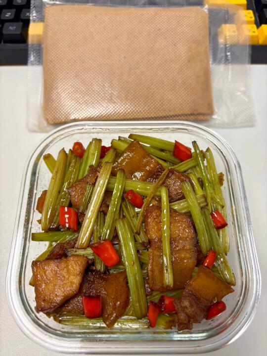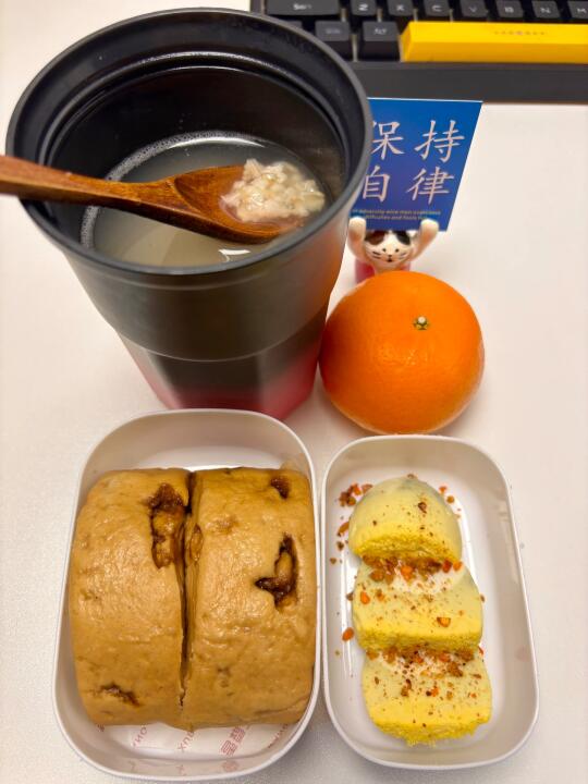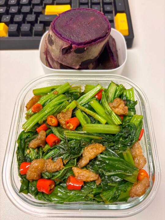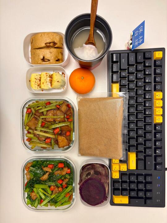 1⃣️早:燕麦、红糖馒头、实蛋(3.3💰) 2⃣️中:芹菜炒肉、煎饼(4.6💰) 3⃣️晚:青菜炒油渣、紫薯(2.2💰) 4️⃣水果:沃柑(0.8💰) 肉市场买的17一斤约3💰|猪油渣约0.5💰 合计:10.9💰
