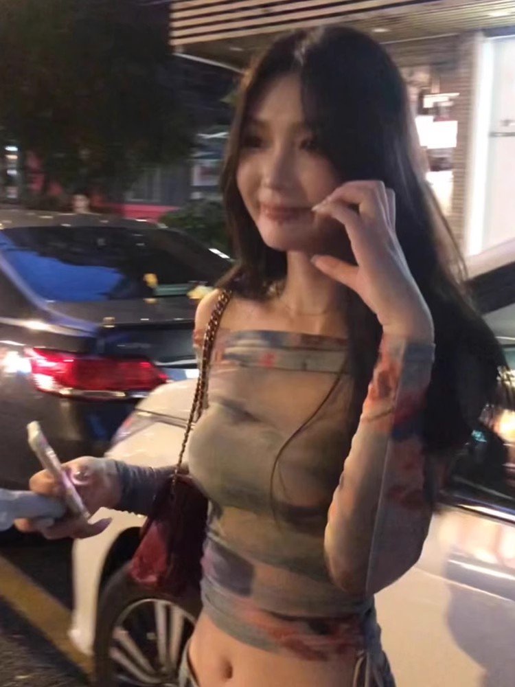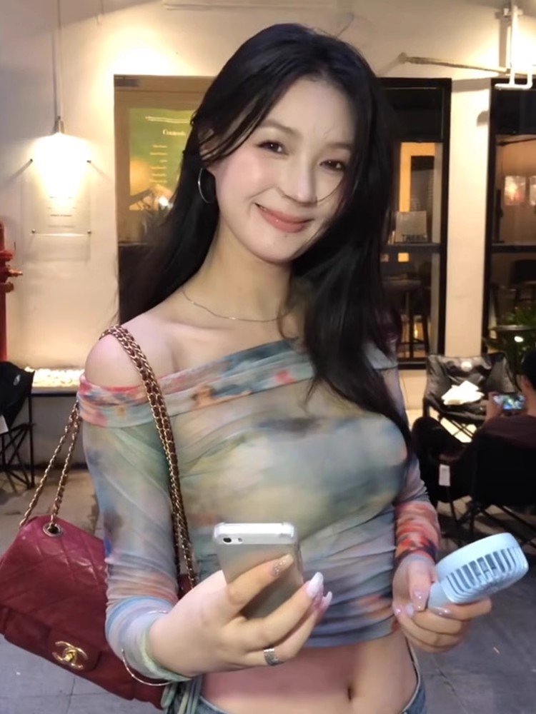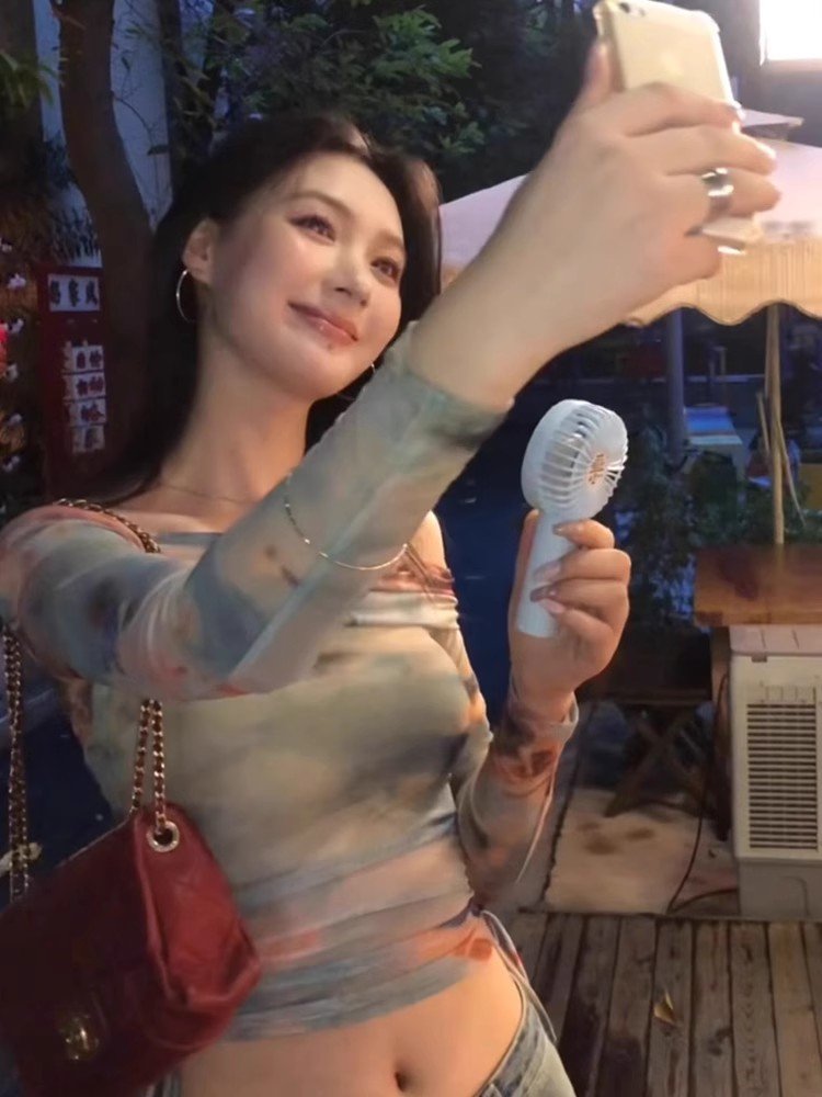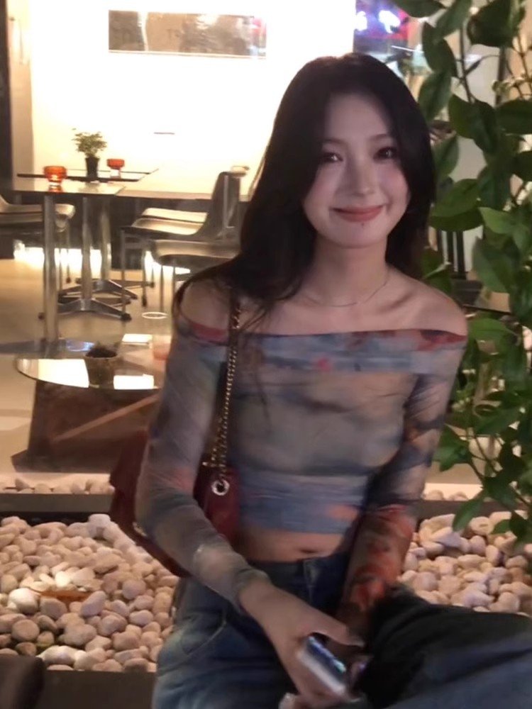 美式复古撞色网纱一字肩长袖t恤女夏季小个